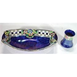 Oval Maling dish hand coloured and transfer printed with panels of flowers onto a black and white checked and blue iridescent ground, marks to base, 32cm in length