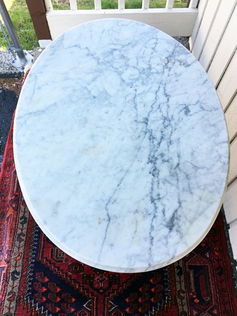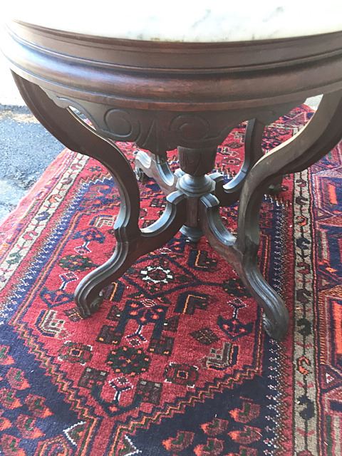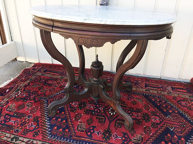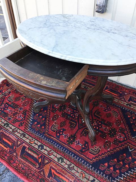 Oval Marble Top Table with Secret Drawer. Years ago people would put their valuables in these drawers to hide them. Very unique, Walnut, nice oval white marble, center urn finial at base.