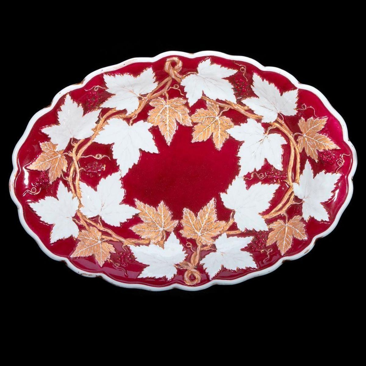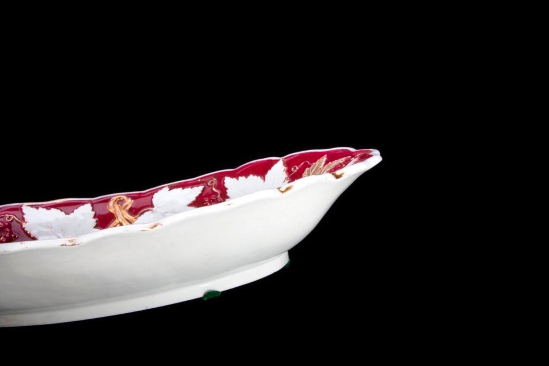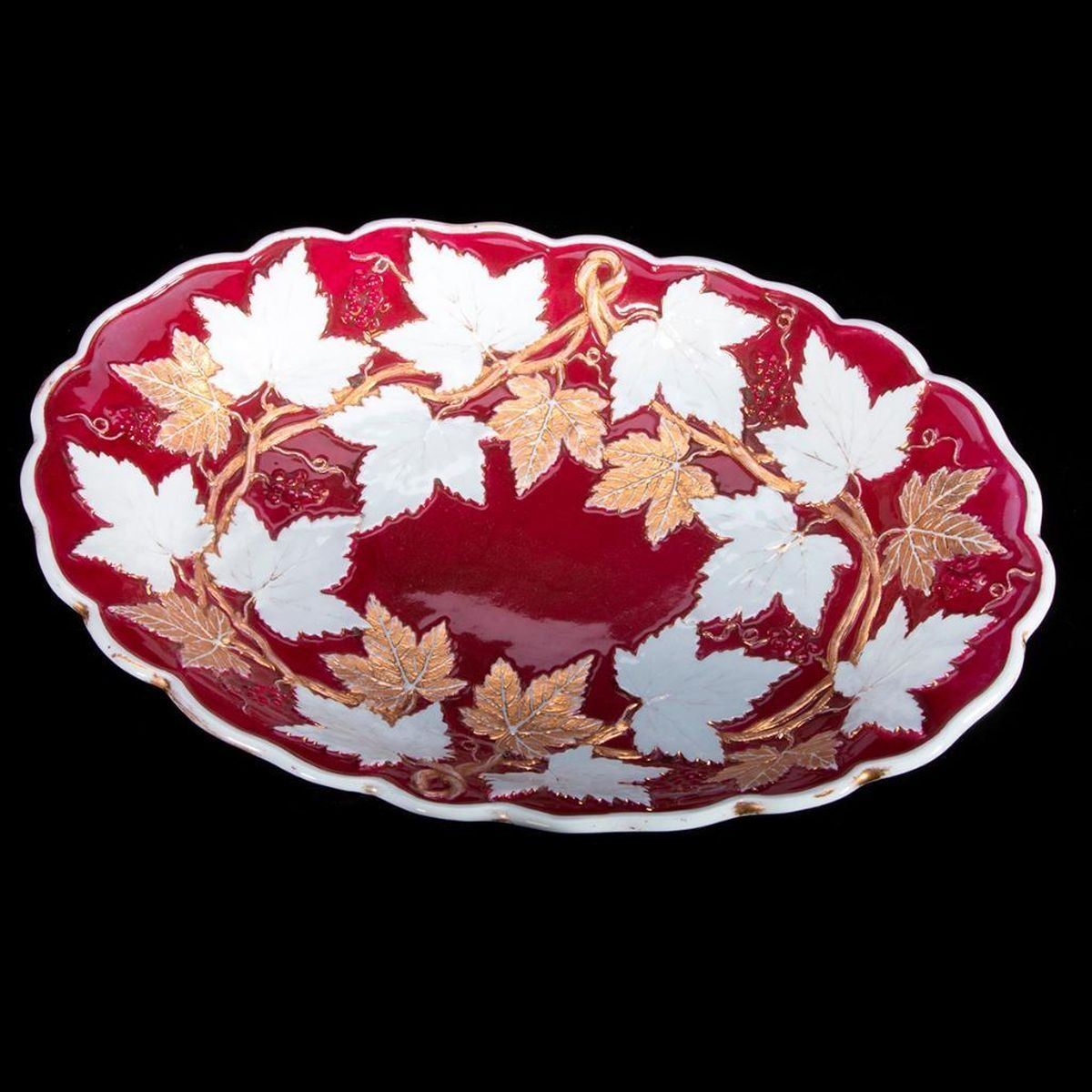Raised relief of red, white with gold grape leaves and graps oval serving bowl with underglaze blue crossed swords mark on the underside. H-2.25" W-8.25" D-8 Very Good