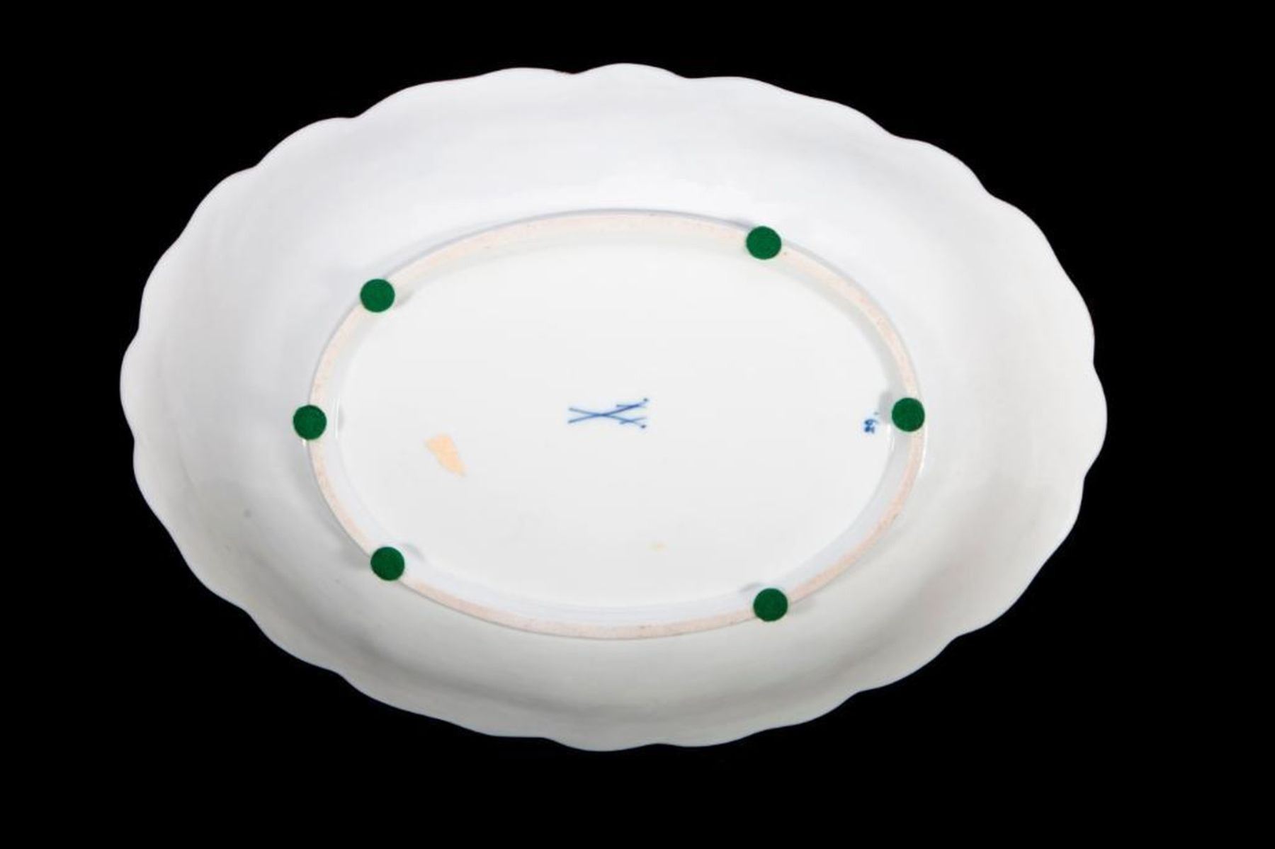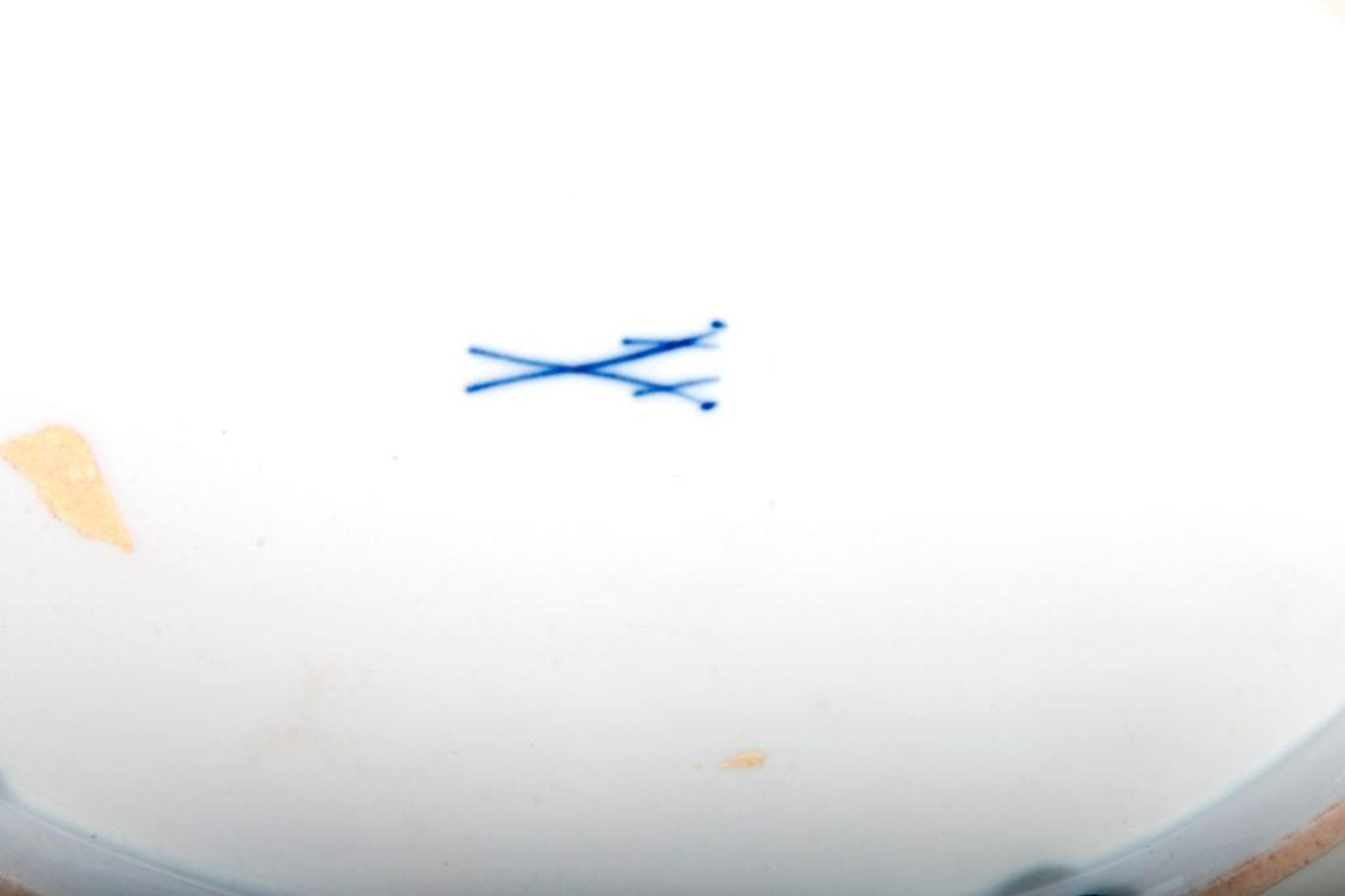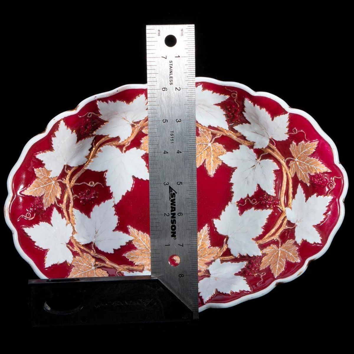 Raised relief of red, white with gold grape leaves and graps oval serving bowl with underglaze blue crossed swords mark on the underside. H-2.25" W-8.25" D-8 Very Good