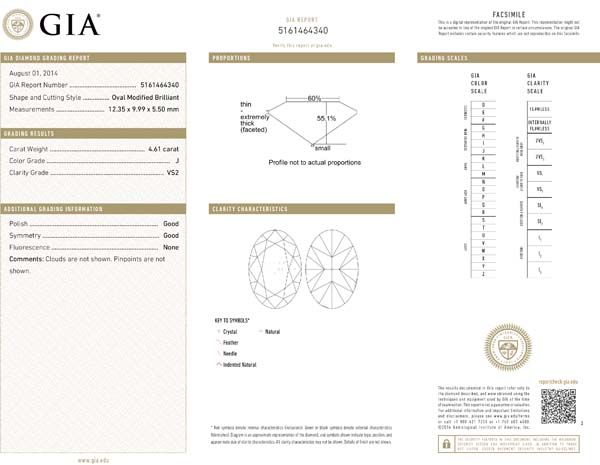 Oval Shape Diamond 4.61caratJ:VS2:GIA:Dim.:12.35*9.99*5.50:Cert.5161464340