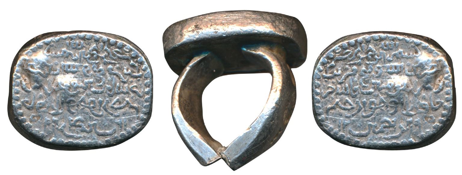 Oval Silver Ring, 10.27g, with Arabic spells for divine intercession (Dua) derived from Quranic verses, undated. The inscription begins with the ‘Bismillah’, ??? ???? ?????? ?????? (Bismillah al-Rahman il-Raheem, “in the name of the God, the compassionate and the merciful”), then follows on with the invocation ??? ?? ???? ? ??? ???? (Nasr man Allah wa Fatah Qareeb, “Help from the God, (brings) the Victory closer”, Qura’an Chapter 61, Sura al-Saff, verse 13). It ends with ????? ??? ???? ? ??? ???? ???????? (Fallahu khairun hafeezan wa huwa Arhamur Rahimeen, “But Allah is the best Guardian, and He is the most merciful of those who show mercy, Qura’an Chapter 12, Yusuf, verse 64). The last spell is usually recited for safe pregnancy / delivery or cure from an illness.