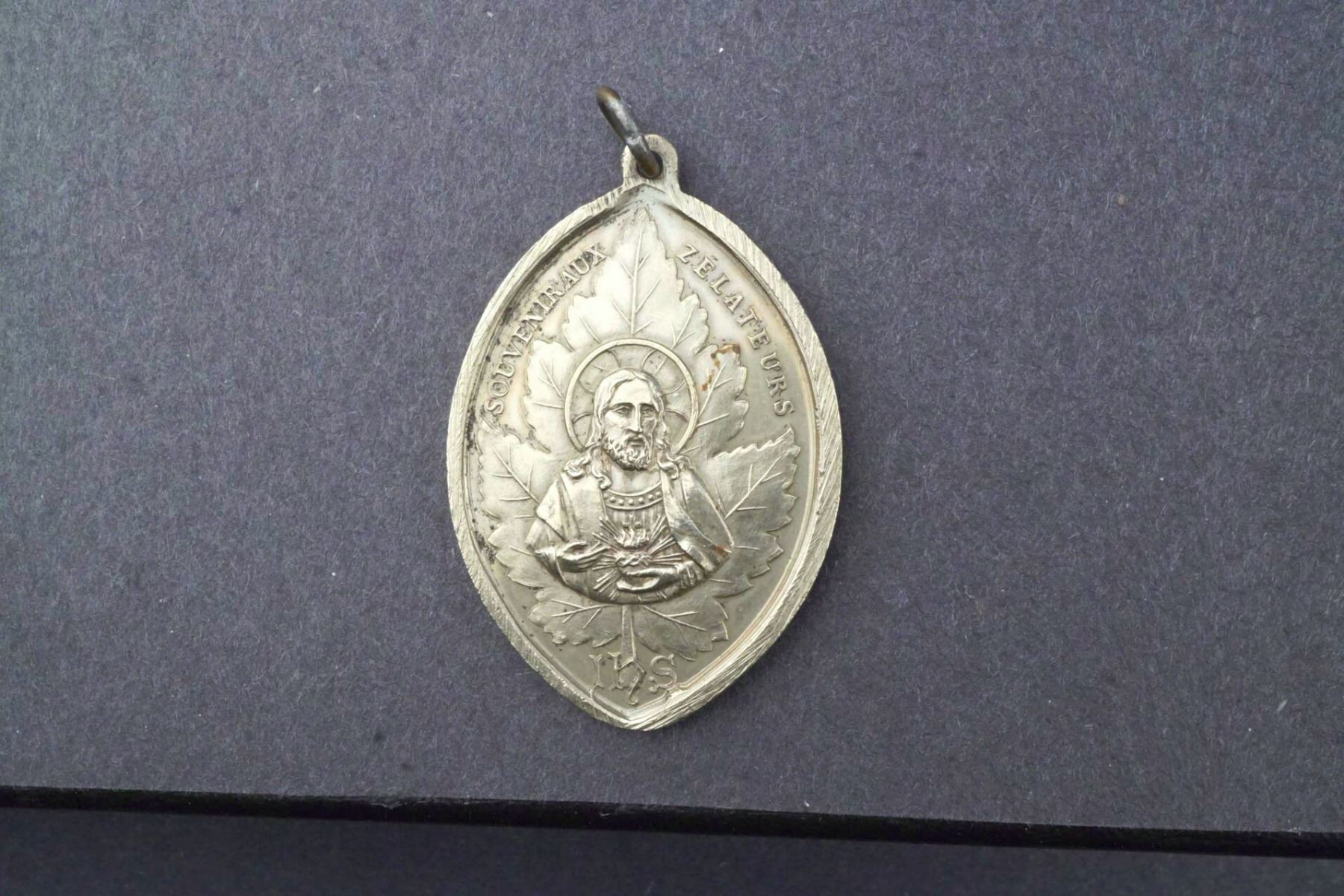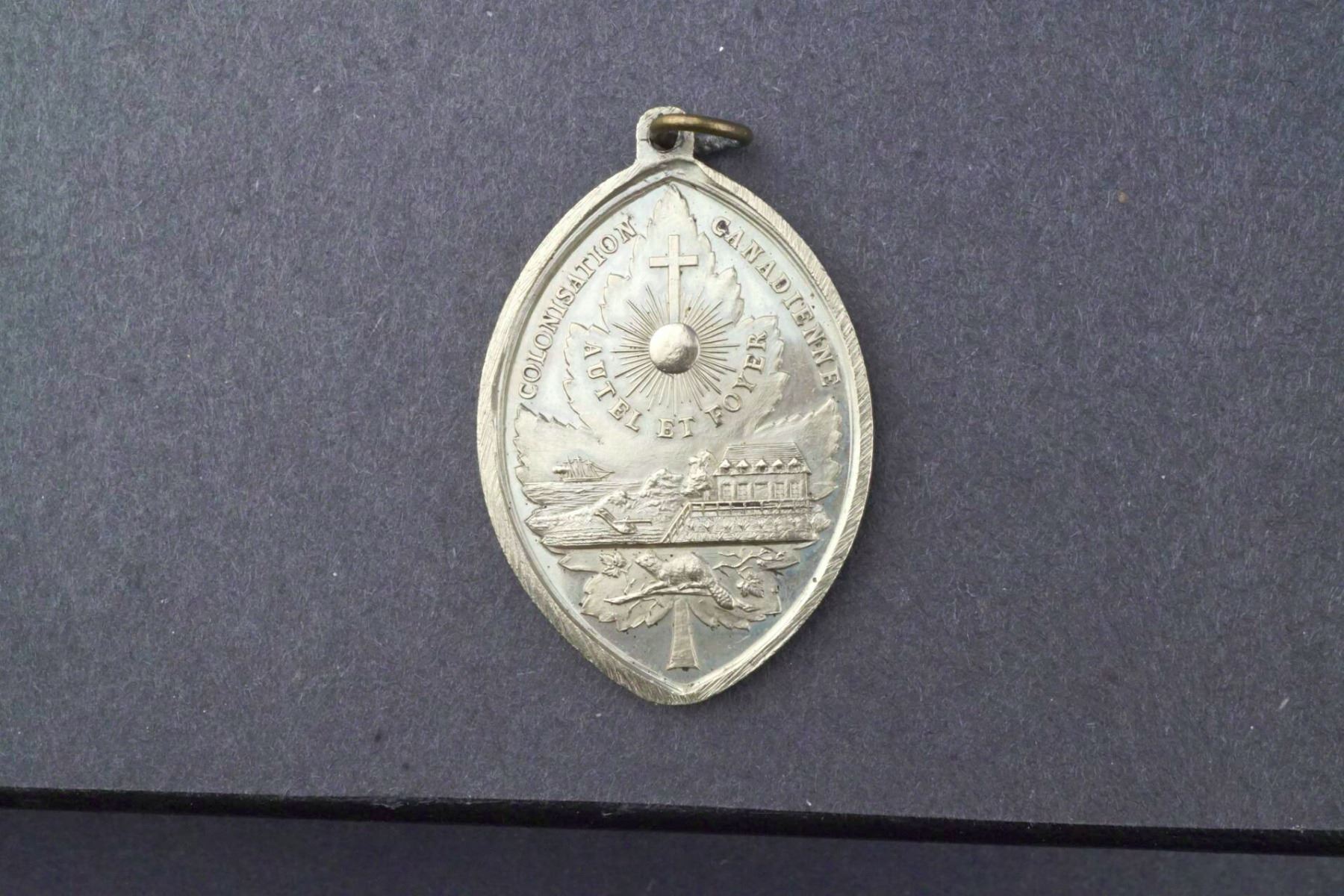 Oval, Silver or Silver plated Medal SOUVENIR AUX ZÉLATEURS - COLONISATION CANADIENNE. Obverse: Facing bust of Christ, superimposed on a maple leaf. Reverse: At top, sun surmounted by crucifix. On a maple leaf, AUTEL ET FOYER on bottom of the leaf. In the lower part, Ship on sea, building on land, beaver below. Loop for suspension on top. 52 mm in height, 25.7 grams.
