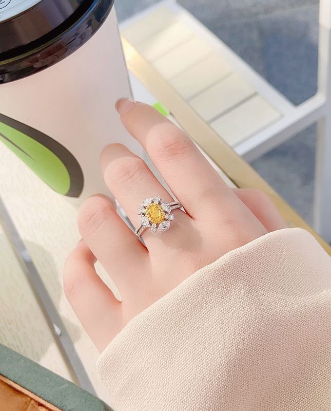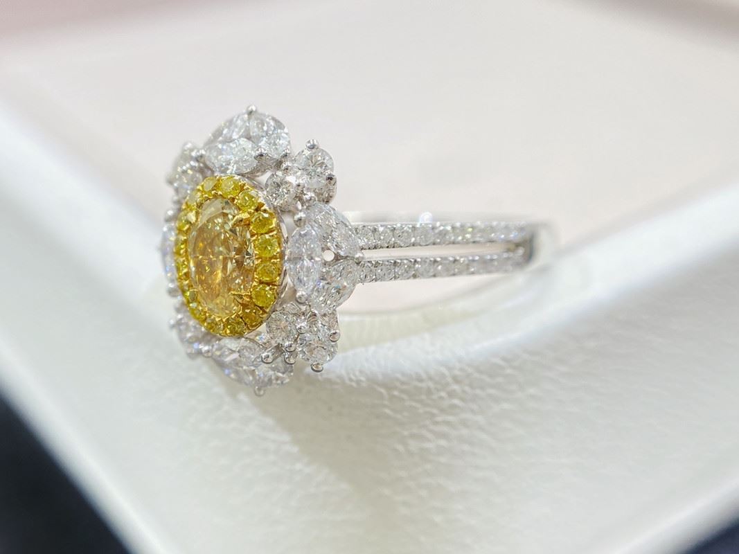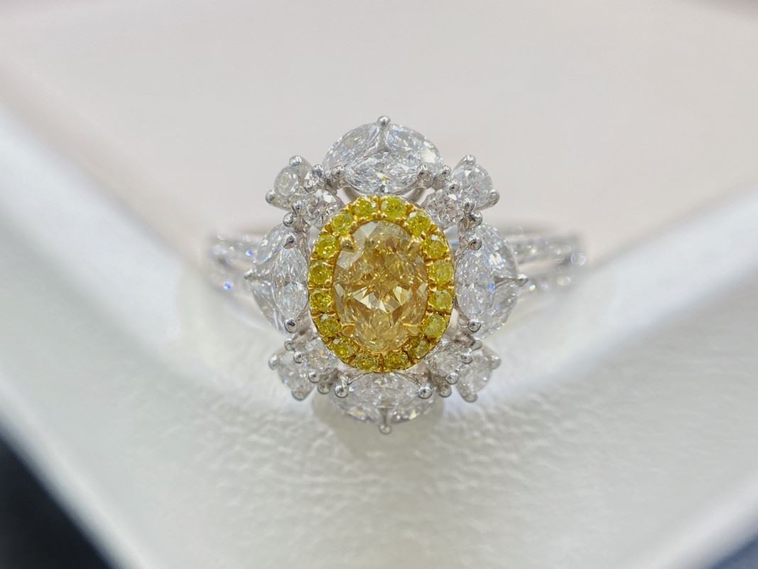 A vivid oval yellow diamond radiates at the center, surrounded by pear- and oval-cut white diamonds forming a regal floral halo. Its luminous design embodies sophistication and timeless luxury. Ring size: 6, circumference: 52 mm, diameter: 16.6 mm, main diamond: 0.385 ct, side diamonds: 0.721 ct. Note: Comes with an AGL certificate and a domestic jewelry identification certificate.