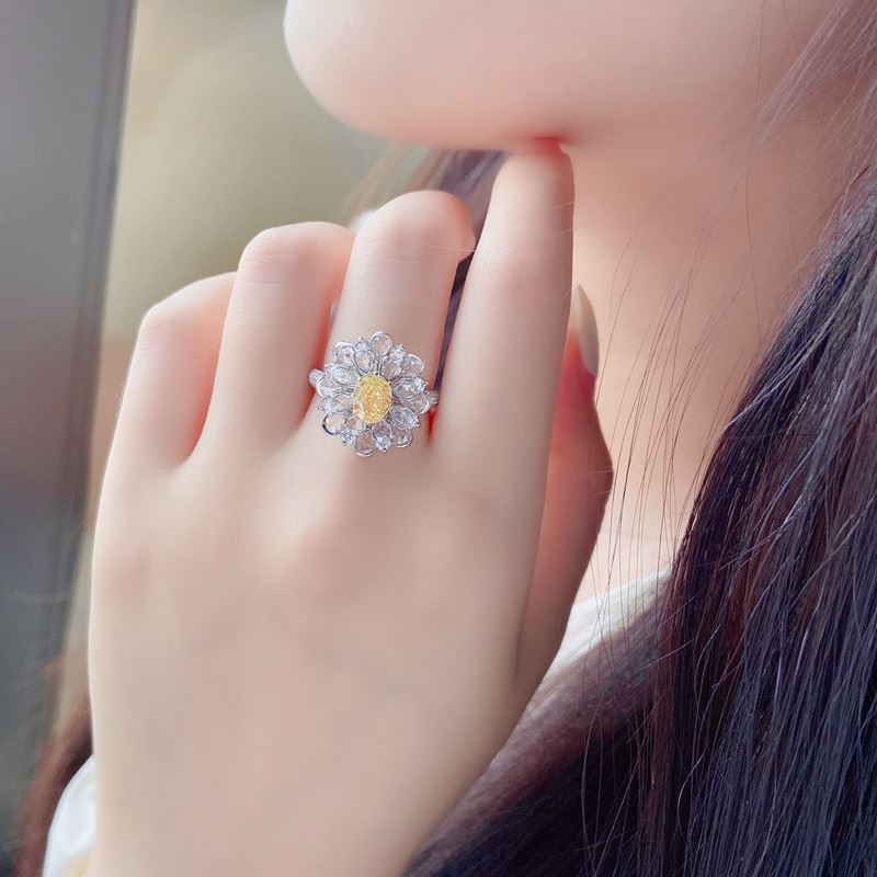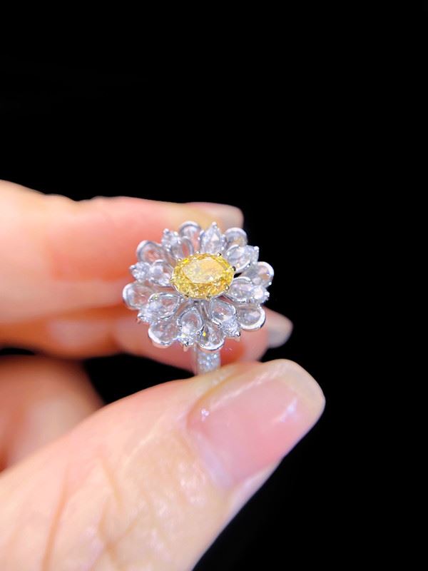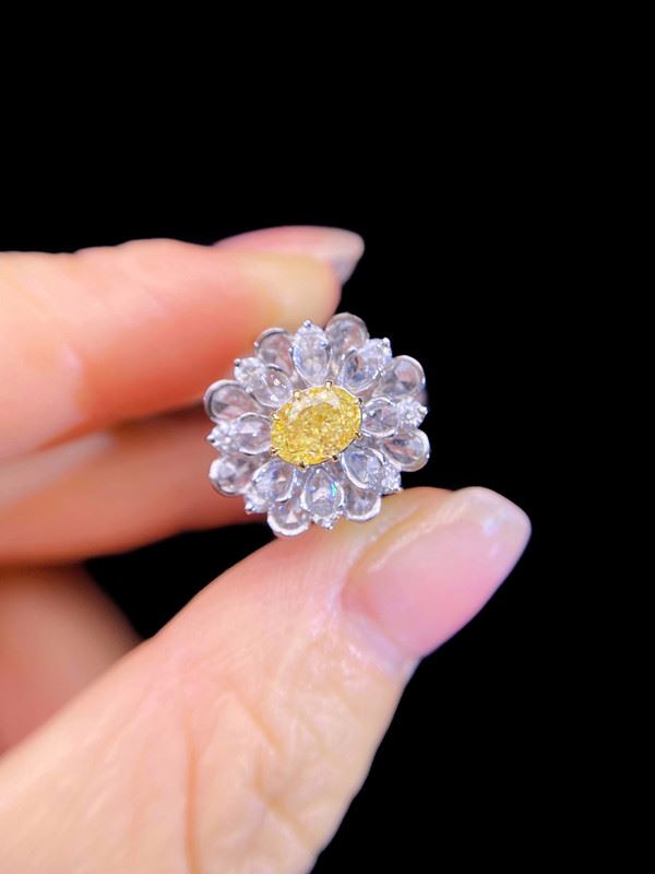 A radiant oval yellow diamond sits at the heart, encircled by layers of pear-shaped white diamonds like blooming petals. Brilliant and elegant, it captures both grace and luxury in perfect harmony. Ring size: 6, circumference: 52 mm, diameter: 16.6 mm, main stone: 1.01ct, side diamonds: 1.382ct. Note: Comes with a GIA Natural Diamond Report and a Beijing NGTC certificate.