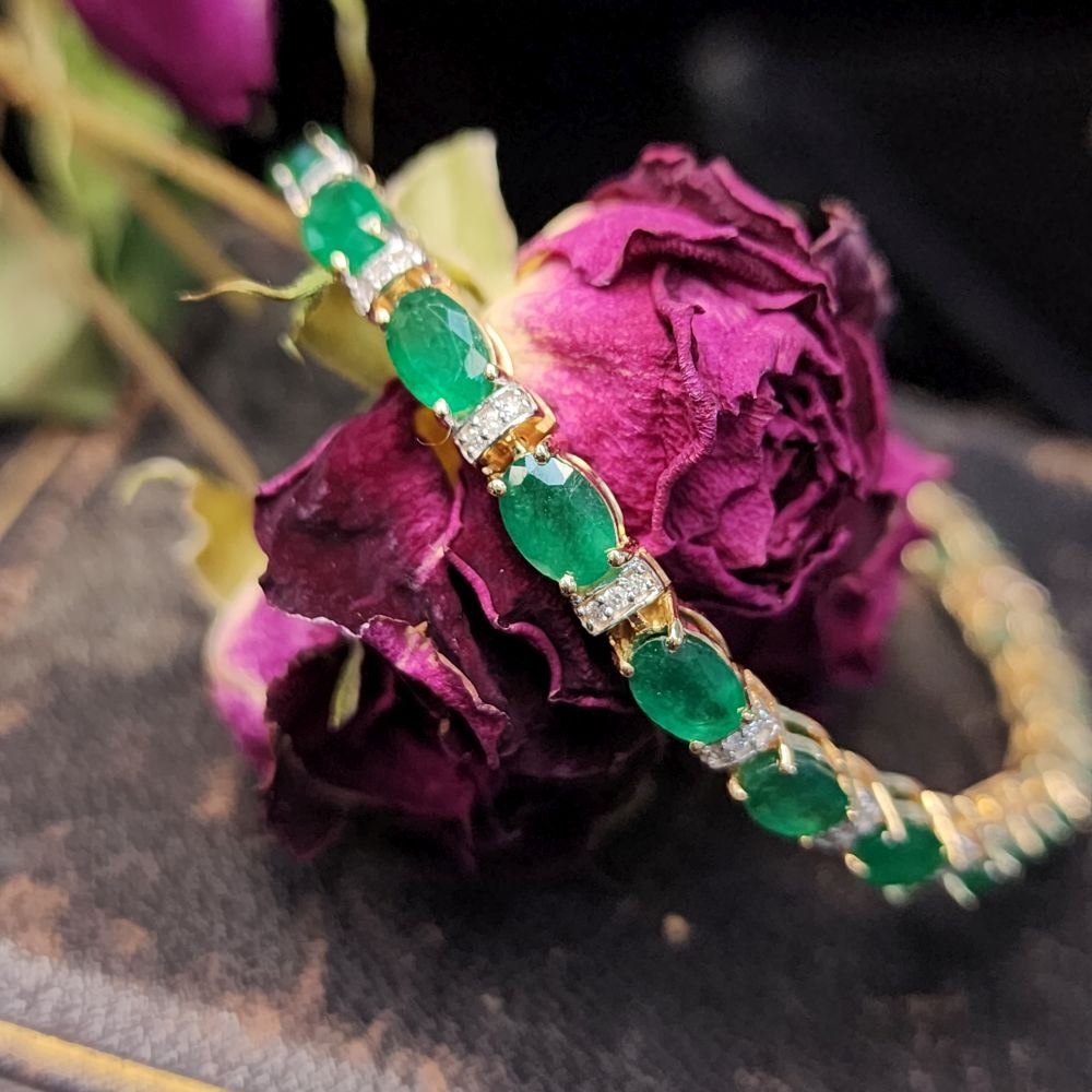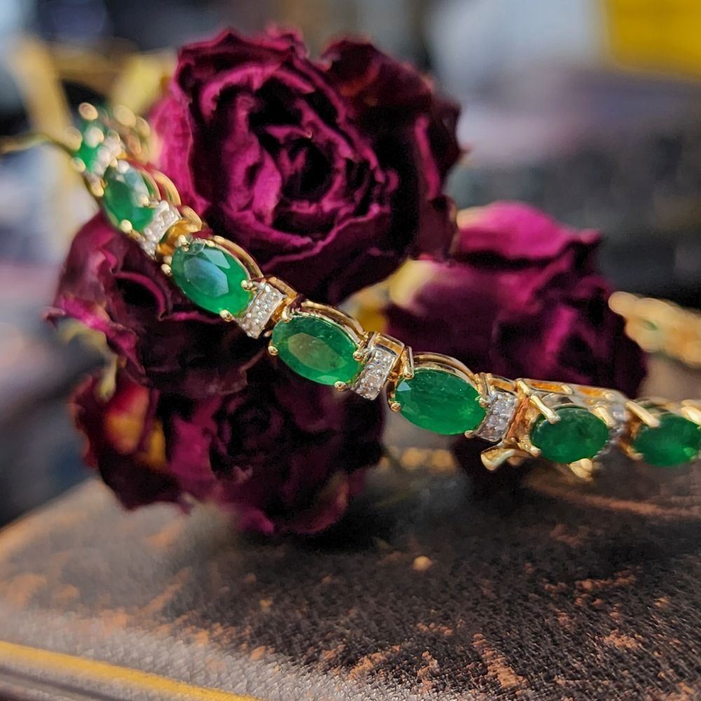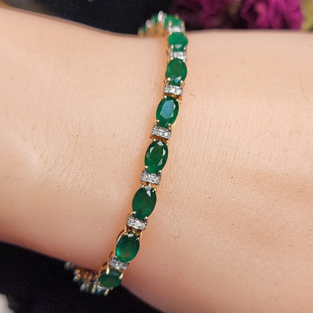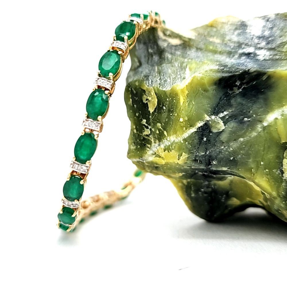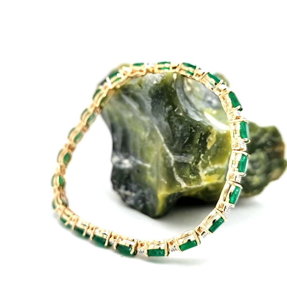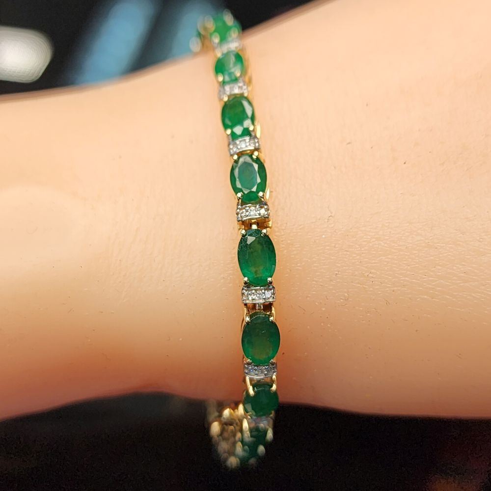 Genuine Emerald and Earth-Mined Diamond Bracelet.& nbsp; There is 9.90 carats of oval cut deep green emeralds in this 14 karat yellow gold bracelet and .23 carats of round, brilliant-cut, H-I color, I1 clarity diamonds create sparkling dividers for the hinged links on this flexible bracelet.& nbsp; The bracelet is 7& quot; long and approximately 4 mm wide and has a hidden box clasp with a safety clip.& nbsp; This bracelet is certified and appraised for $22,524.00 estimated retail replacement value.