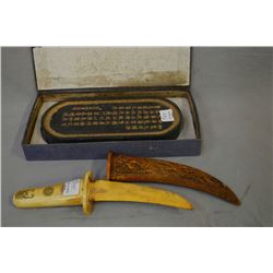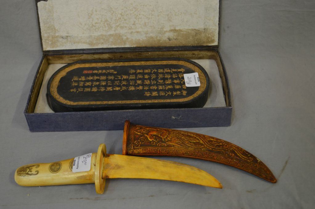 Oval gilt "Poem of Scholar" dark ink block, purportedly 19th century and a bone knife and scabbard