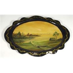 Oval tin tray painted with a landscape scene entitled 'The Pupua Ayxiouz - 94', 52cm in length