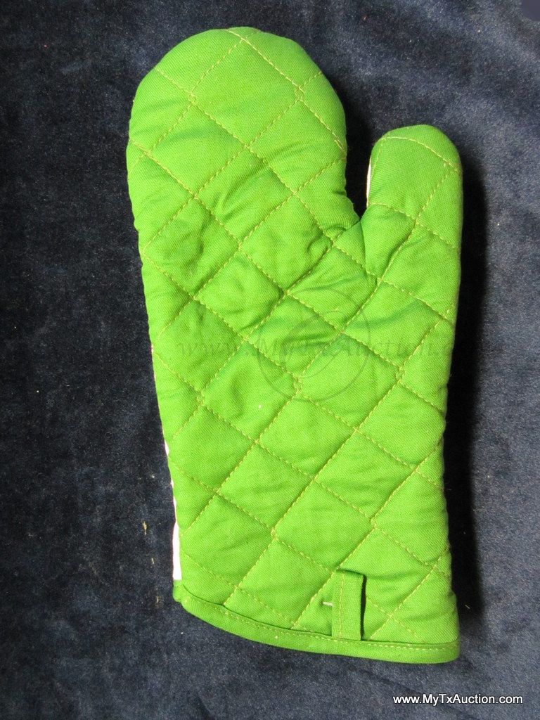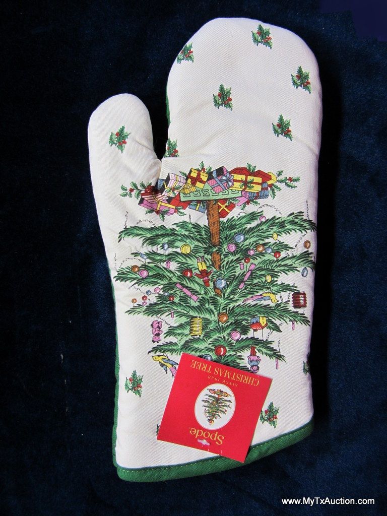 Kitchen oven mitt is terry cloth lined, green quilted material on the holder side, with Christmas tree on the decretive side.