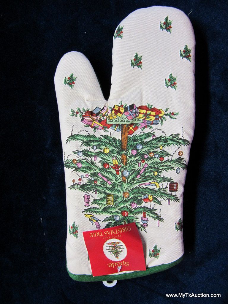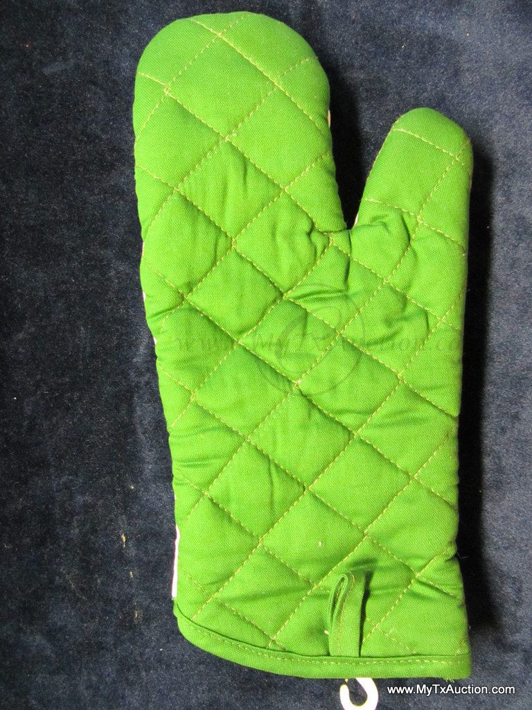 Kitchen oven mitt is terry cloth lined, green quilted material on the holder side, with Christmas tree on the decretive side.
