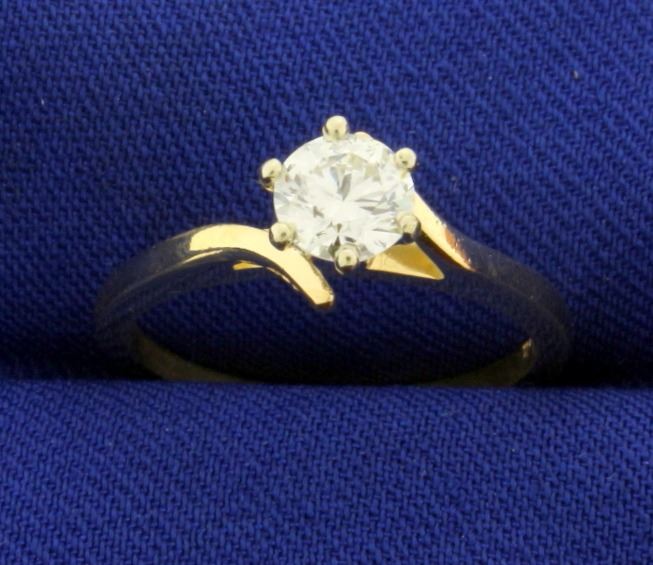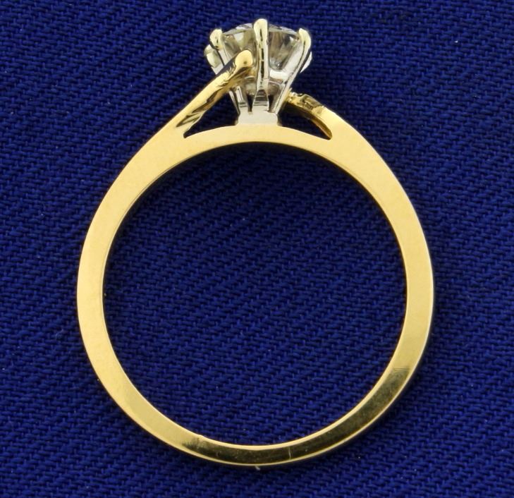 In 18k yellow gold, .57ct round brilliant diamond with very high quality VS clarity/H color. Size 6 1/4. 2.5g.