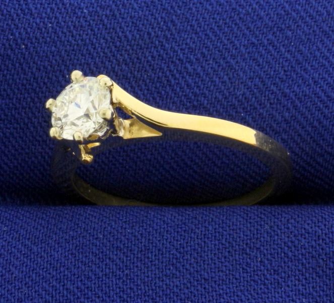 In 18k yellow gold, .57ct round brilliant diamond with very high quality VS clarity/H color. Size 6 1/4. 2.5g.