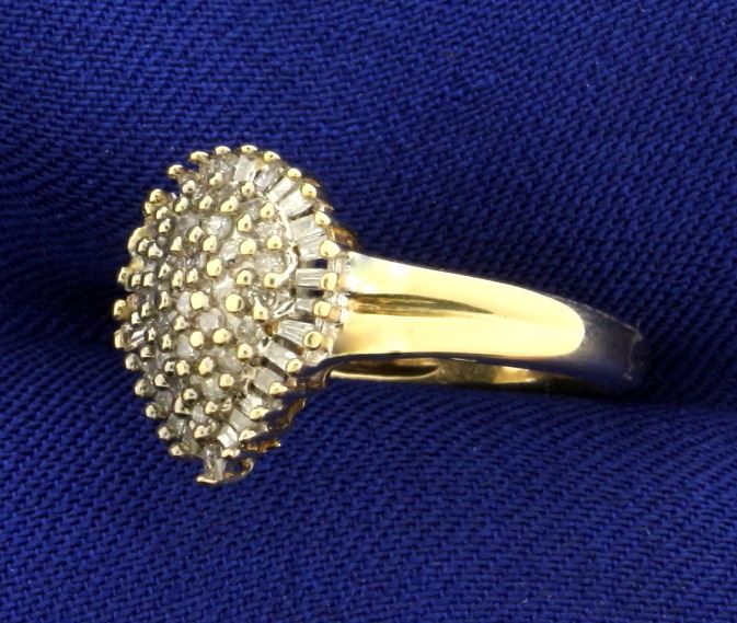 In 10k yellow gold. Containing twenty seven round .01ct diamonds and twenty nine baguette .01ct diamonds. Size 5. 2.3g.