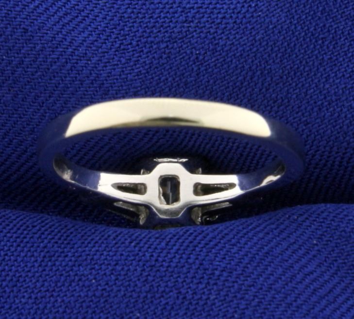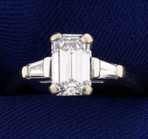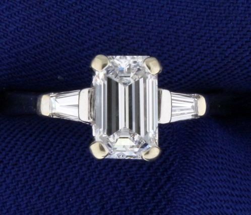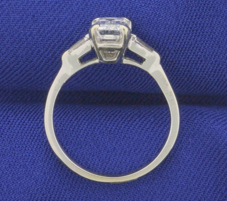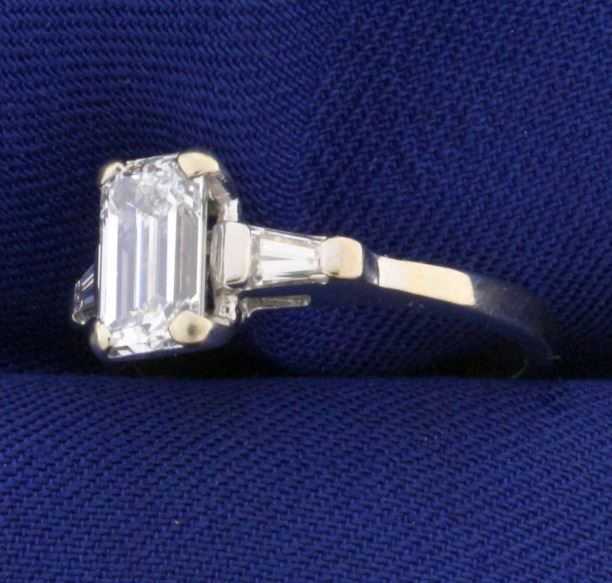 In 14k White Gold. Center Diamond is 1.3 ct very high quality Emerald cut diamond, vs 1 clarity/F color. Also contains two 1/8 ct baguette diamonds of similar high quality on sides. Size 6 1/2. 2.9g