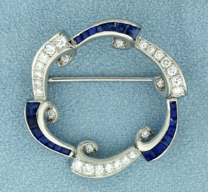 In 14k white gold with alternating waves of diamonds and sapphires in a circle pattern. Contains 27 high quality round brilliant cut diamonds, 0.85 carats total weight, G color, VS clarity. Also contains 21 square cut high quality natural sapphires, 1.4-2.5mm each, 0.75 carats total weight, with bright blue color and excellent clarity. Pin measures 1.25” in diameter. 10.0g