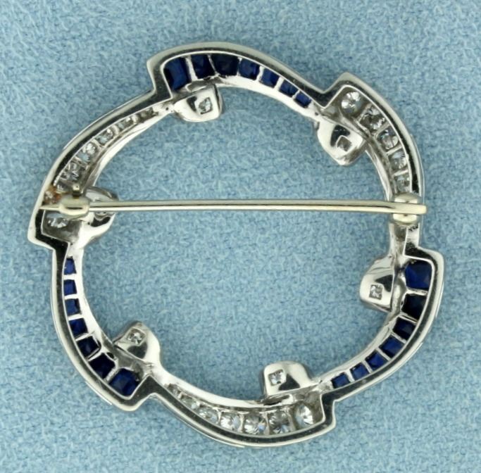 In 14k white gold with alternating waves of diamonds and sapphires in a circle pattern. Contains 27 high quality round brilliant cut diamonds, 0.85 carats total weight, G color, VS clarity. Also contains 21 square cut high quality natural sapphires, 1.4-2.5mm each, 0.75 carats total weight, with bright blue color and excellent clarity. Pin measures 1.25” in diameter. 10.0g