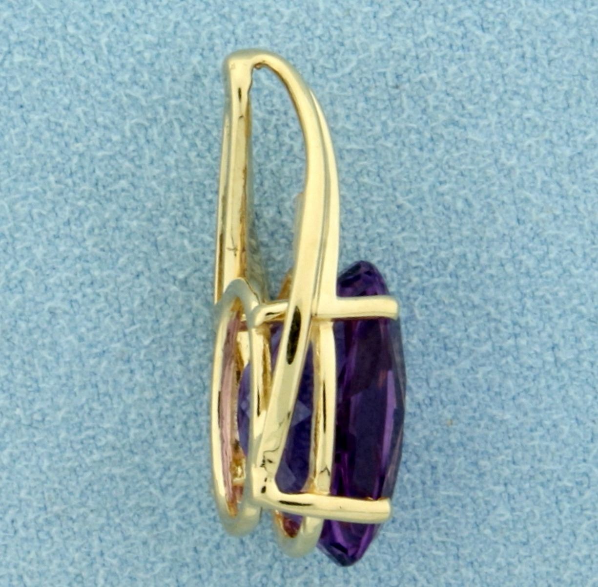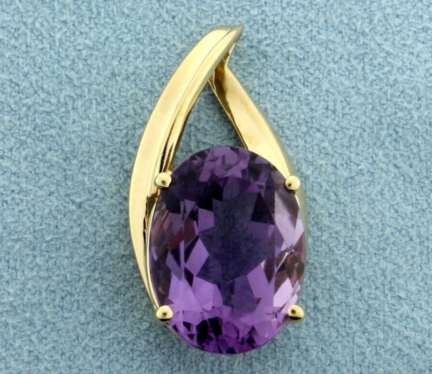 In 10K Yellow Gold. Contains a natural high quality 16x12mm Amethyst gemstone with beautiful vibrant pastel purple color and excellent clarity. 1" long with bale. 4.5g
