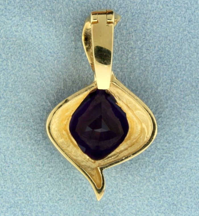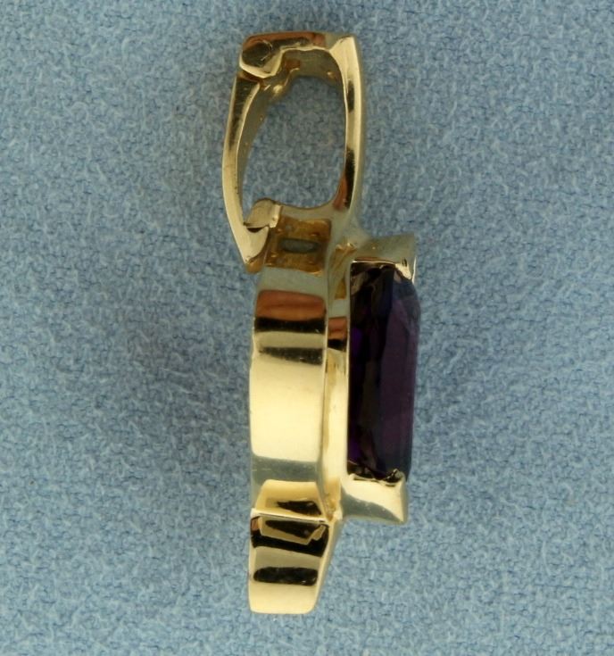 In 14k yellow gold and is approx. 1.25” x 0.75”. Amethyst is very high quality fancy teardrop cut, 13.9x15.1mm with a deep highly saturated purple color and excellent clarity. It is accented with 4 high quality round brilliant cut diamonds, 0.03 carats total weight, G color, VS clarity. The bale is hinged so it can accommodate up to 6mm wide chain. 7.9g