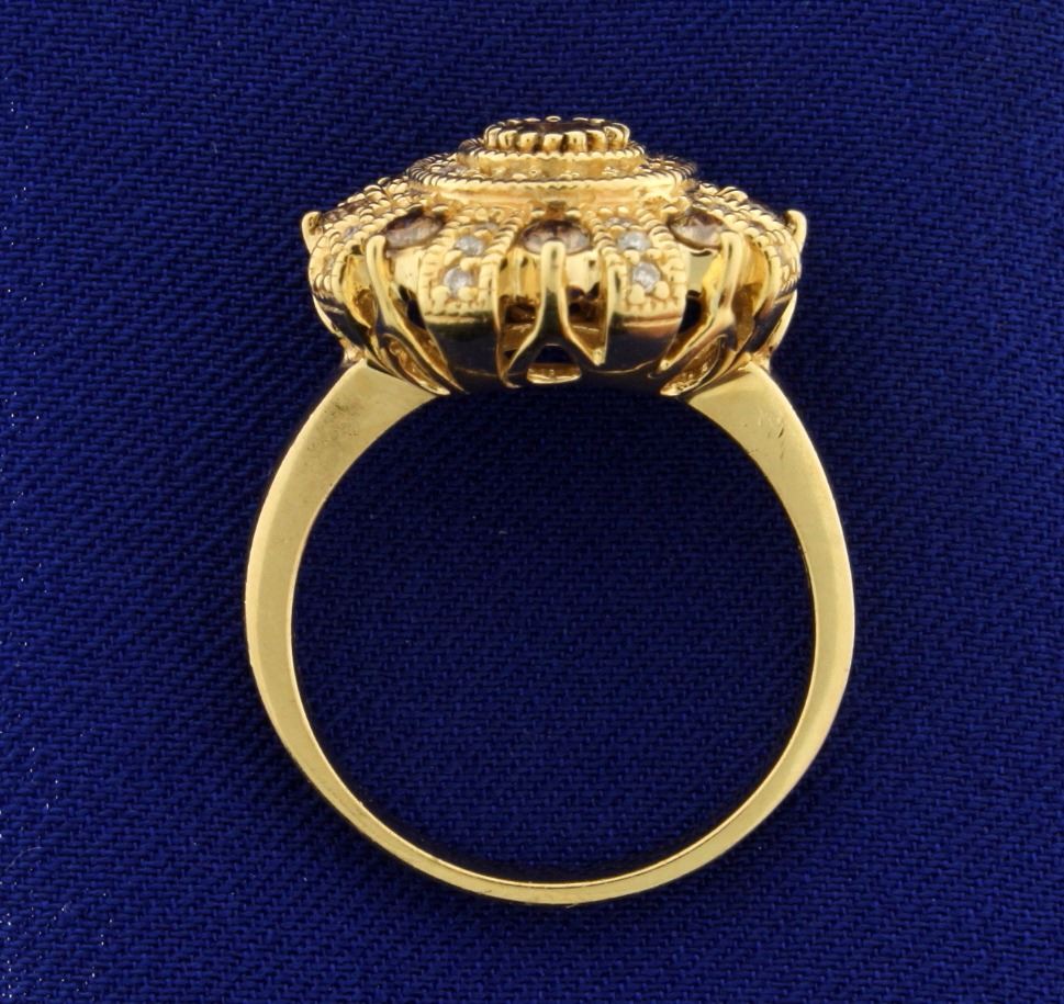 In 14k yellow gold. Center diamond is 1/4 ct Champagne colored diamond with warm color. Also contains eight .05 ct champagne diamonds and .4ct Tw of round "white" diamonds. Size 8 1/2. 8.2g.