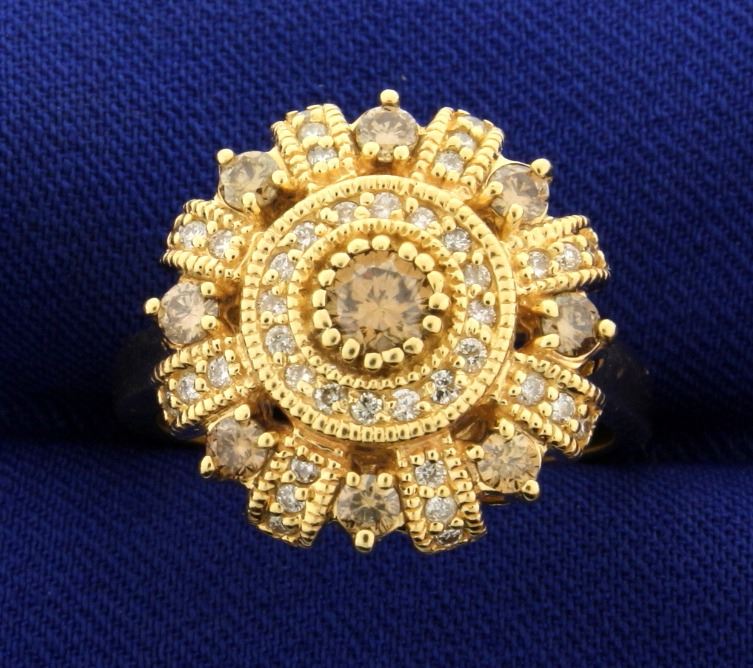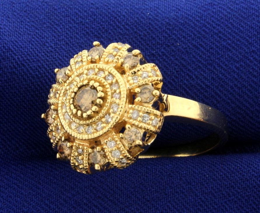 In 14k yellow gold. Center diamond is 1/4 ct Champagne colored diamond with warm color. Also contains eight .05 ct champagne diamonds and .4ct Tw of round "white" diamonds. Size 8 1/2. 8.2g.