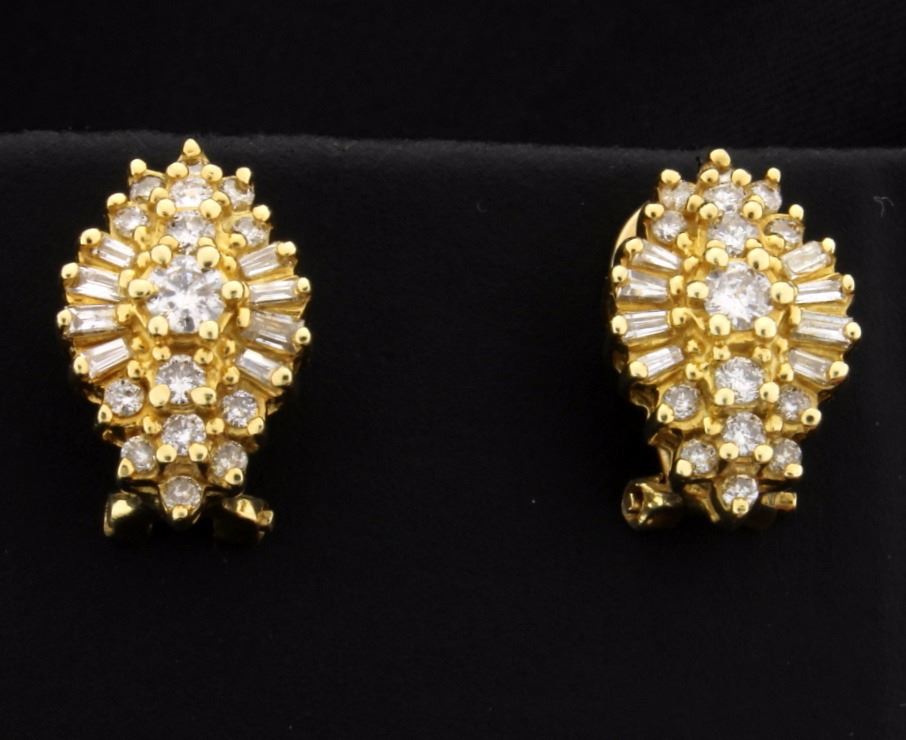 In 14K yellow gold, they are 5/8 inch long and have safety backs. Each earring contains a center diamond of .10ct, surrounded by two .03ct, two .02ct, and ten .01ct round diamonds. As well as approx 1/4cts total weight of baguettes. All good quality diamonds with lots of sparkle. 5.5g