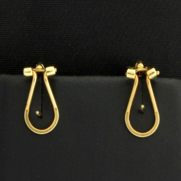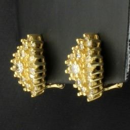 In 14K yellow gold, they are 5/8 inch long and have safety backs. Each earring contains a center diamond of .10ct, surrounded by two .03ct, two .02ct, and ten .01ct round diamonds. As well as approx 1/4cts total weight of baguettes. All good quality diamonds with lots of sparkle. 5.5g