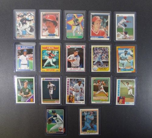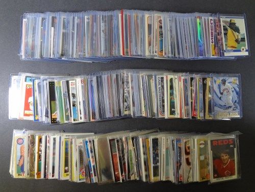 All your favorite Stars, Mostly NM-MT, Guaranteed big names such as Reggie Jackson, Nolan Ryan, Tom Seaver, Cal Ripken Jr., Henderson, Bonds, F. Thomas, Maddux, Brett, Yount, Schmidt, Clemens, Clark, Sandberg, Bench, Ozzie Smith, Winfield, Rose, Canseco, Sosa, A.Rod, McGwire, Gwynn, Murray, Griffey, Jeter and many other Major Star Cards. Mostly All Different only few duplicates. Awesome Star Card Lot. Est $270-$300