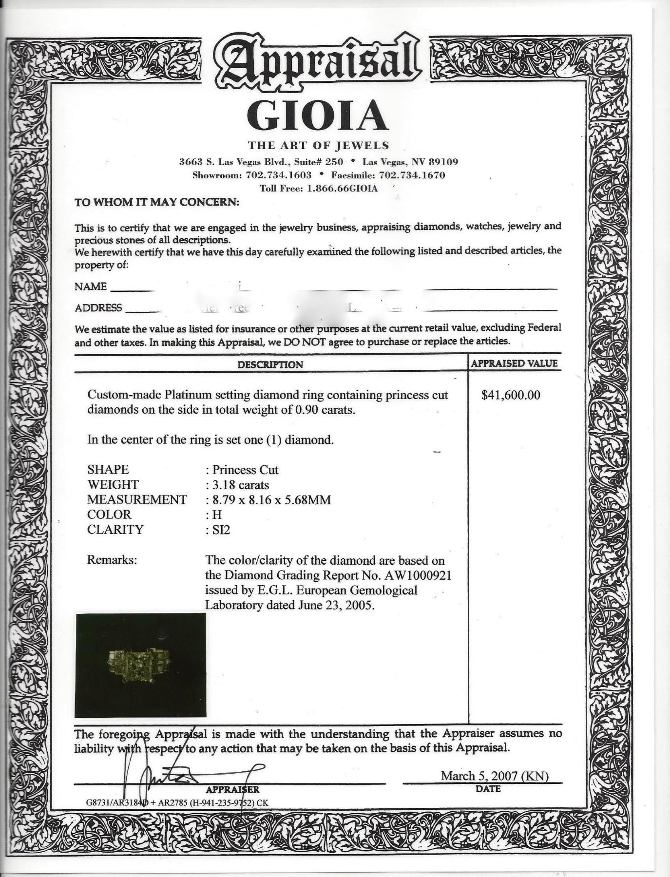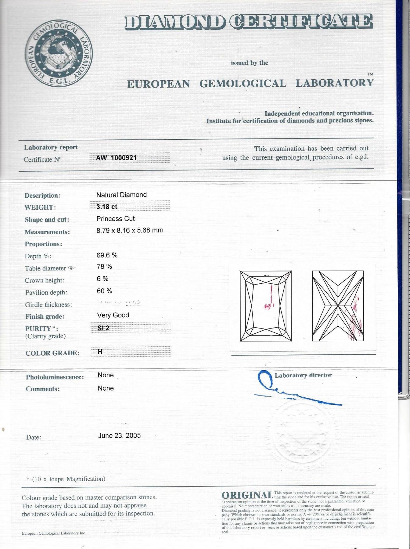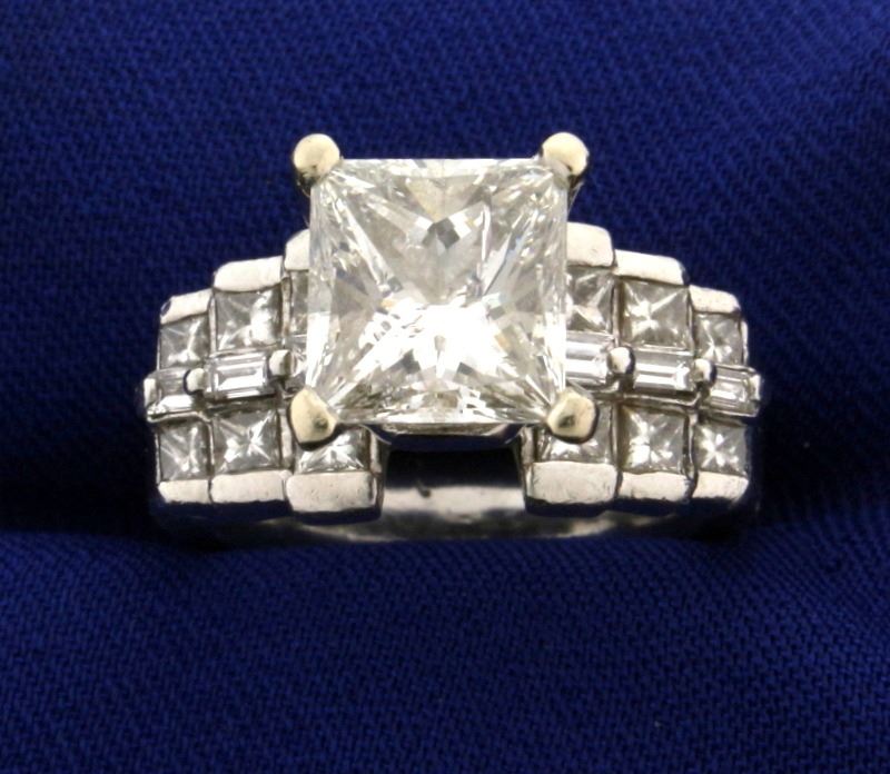 In platinum. Center diamond is high quality EGL certified 3.18ct Princess cut natural diamond H color, SI2 clarity. Also contains .9ct TW of similar quality diamonds in shank. Very good cut diamonds with lots of brilliance and sparkle. Size 5 3/4. 18.3g.