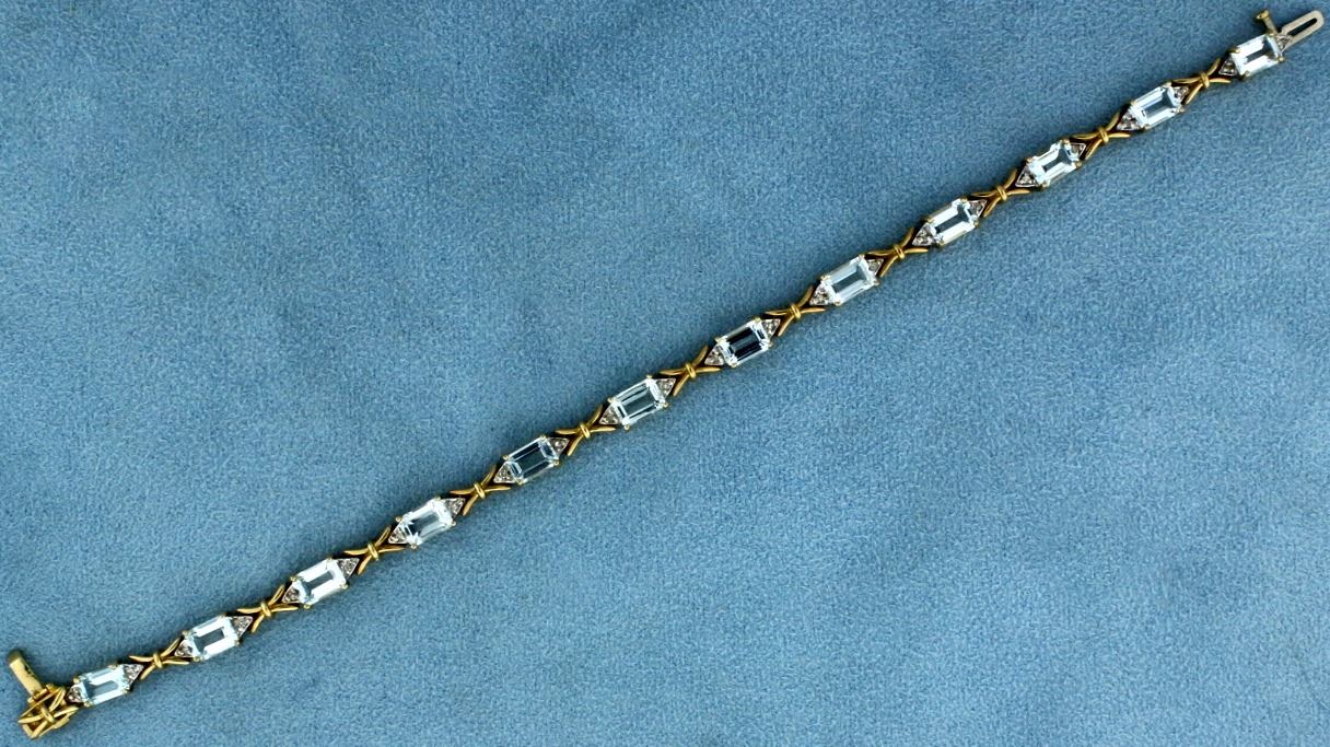 In 10k Yellow Gold. There are 12 high qualty emerald cut blue topaz, 6 carats total weight, with excellent bright blue color and clarity. Also contains 1/4 carats of diamonds, I clarity/I color. 7 inches in length. With safety clasp. 7.6g