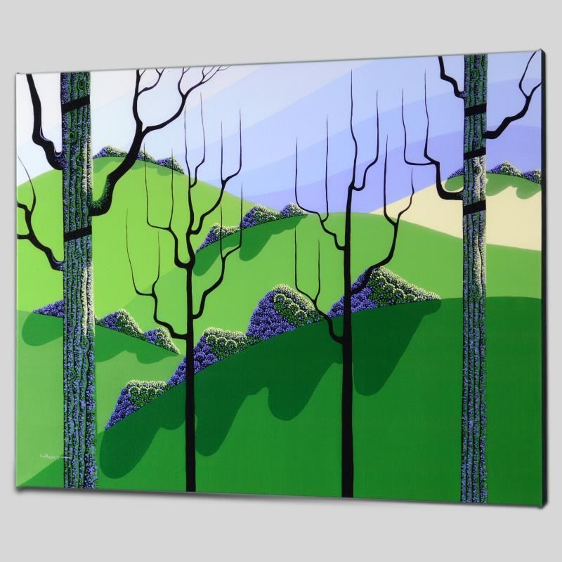 Larissa Holt, a student of distinguished artist Eyvind Earle(1916-2000), uses bold colors and breathtaking scenery to create images of Nature in her own unique style. "Over Hills" is a limited edition giclee on stretched canvas by Holt, numbered and bearing Holt's authorized signature. This piece comes gallery wrapped. Includes Letter of Authenticity. Measures approx. 27" x 22" x 1.5" (image). This item requires special handling and may have a longer than usual turnaround.