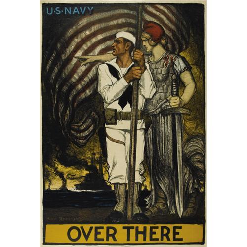 <B>Over There.</B></I> 38" x 56" Artist: Albert Sterner. This poster is one of the few true stone lithograph posters produced during this era. It depicts a sailor standing next to Columbia, they are both looking off into the horizon "Over There" as Columbia points. Behind the pair is a scene of a stormy sea and ships. A wonderful combination of patriotic and naval imagery. <BR><BR>Condition: Fine - slightly yellowed from acid degradation; linen backed.
