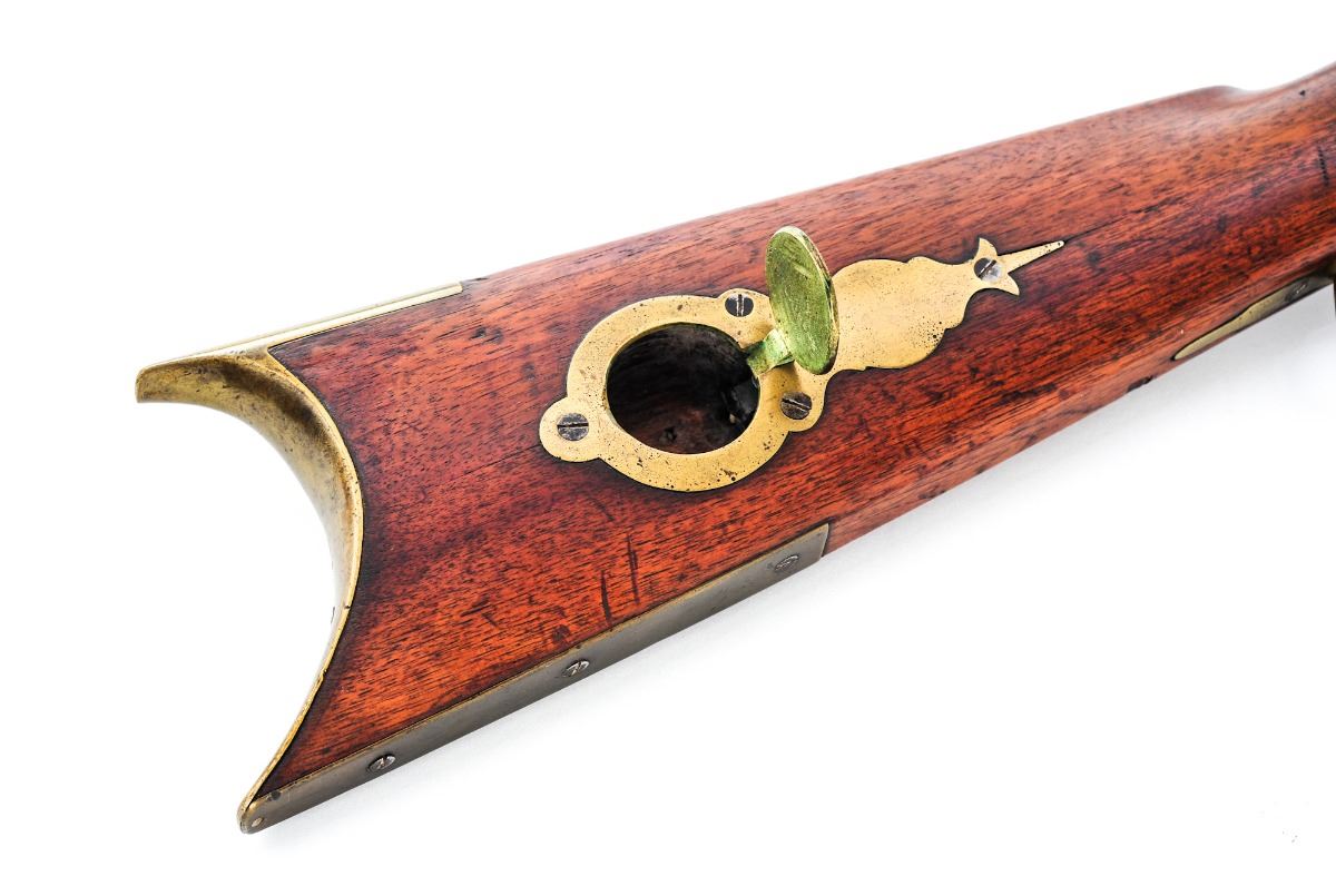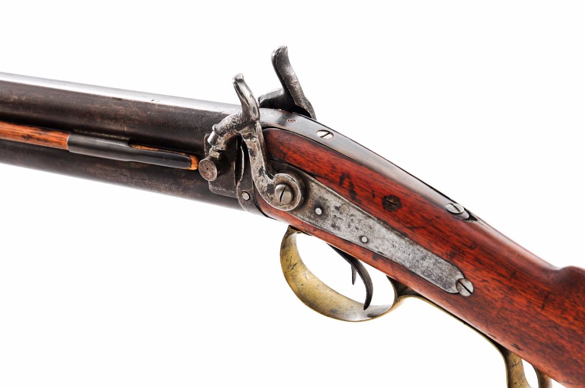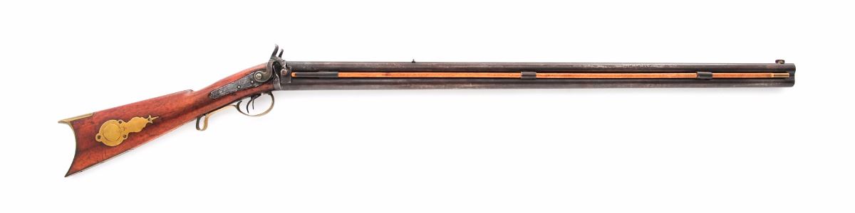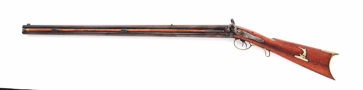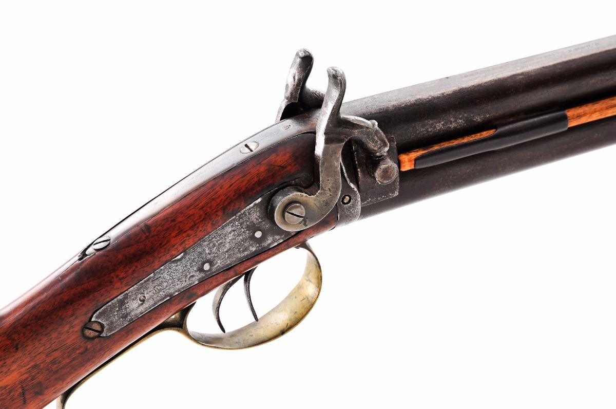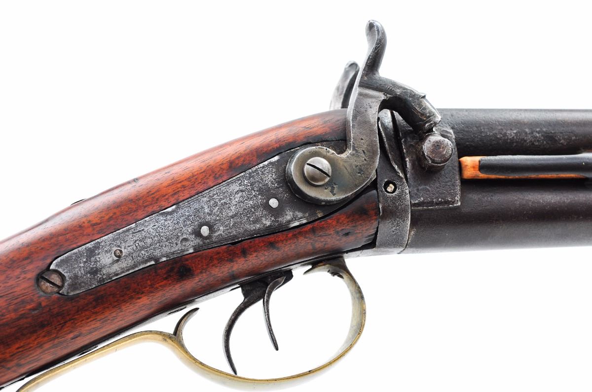 Over/Under Combination Gun by D. Coon, Ithaca, NY, for Display Only, NVSN, .42'' rifled bore over .69'' smoothbore, 34-1/2'' laminated barrels with dovetail small notch rear sight and brass front blade sight; ramrod pipes on both side ribs with brass handled, wood ramrods inserted; locks are marked ''BELL/LONDON'', hammers have half-cock notches; stock has a brass triggerguard with hand stop, brass crescent buttplate and brass patchbox on right side of stock with German silver silhouette scene of a hunter and dog on left side; weight of the gun is 11-3/4 lbs. D. Coon was a member of a gunsmithing family registered as ''Levi Coon & Sons'' in Ithaca, New York beginning in the 1850's. Condition of the gun is for display and non-firing purposes only. Barrels are wobbling and separating from the frame, both triggers are loose in the locks, left hammer is chipped, and the right hammer is a rough replacement. Barrel have accumulated brown corrosion and bores are oxidized dark brown. Stock has shrinkage and is also separating from the frame. Est.: $300-$500. (Antique)