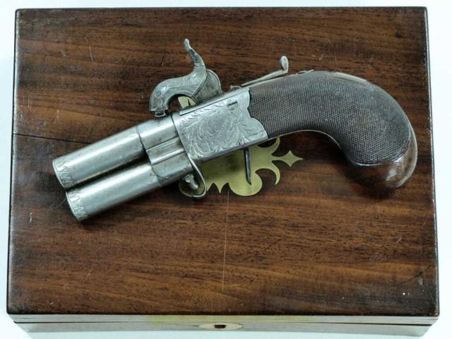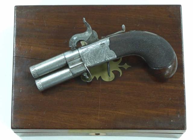 by Younge Sheffield. Pistol features dolphin head hammer and center box lock, engraved frame, engraved tips to the barrels. Finely engraved wood stock, nipple shield intact, double barrel feature works by cocking the hammer and rotating180 degrees. A very nice over/under showing a silver gray finish the fine walnut stock in very good condition. Includes a period mahogany lined case that fits the pistol very tightly. Action is strong. Measures 6" overall, No FFL required.