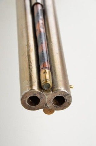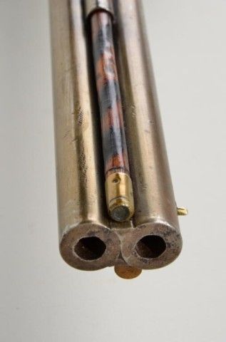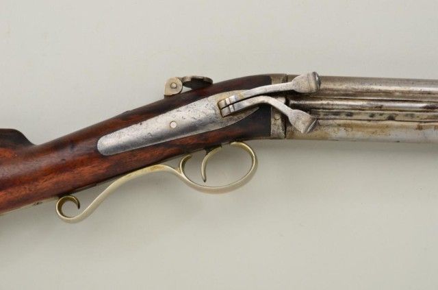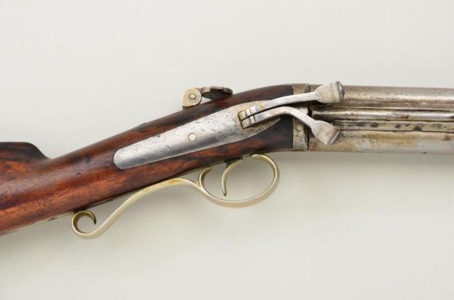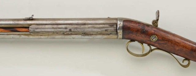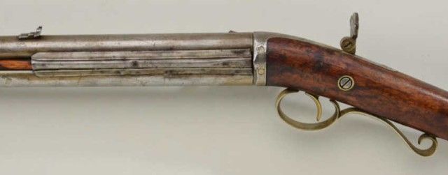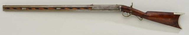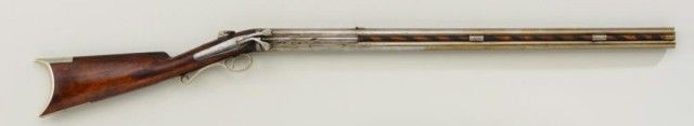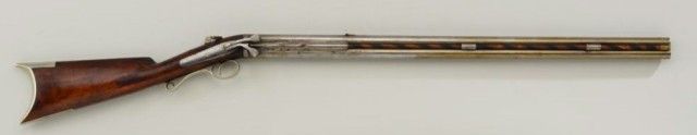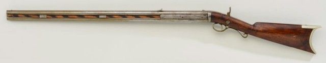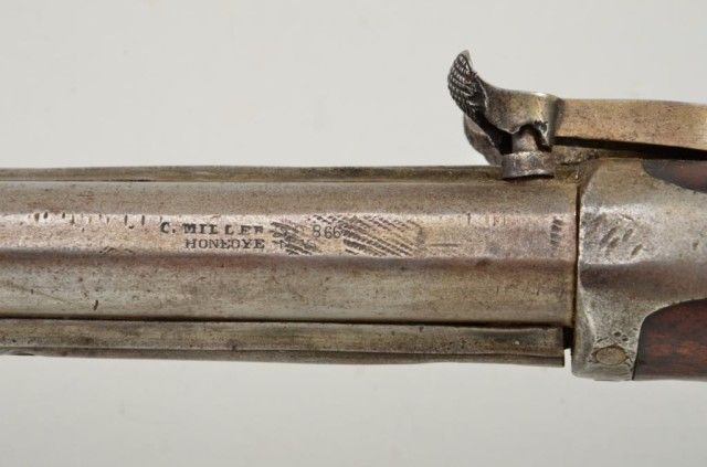 Over and under percussion Mule-Ear plains rifle signed “C. Miller, Honeoye N.Y.” and dated 1866 on breech. The gun shows nickel silver mounts and is approx 36 cal rifled in each bore. The stock shows a slight grainand is in fair condition with normal aging, small dings, mars and some well done repairs. The barrels show a light cleaning to gray metal with some slight pitting and erosion. A period folding peep sight (probablyoriginal) is retained along with two correct style ram rods. The action is working. From an old N.Y. collector’s estate. Est.;$600-$1,200.