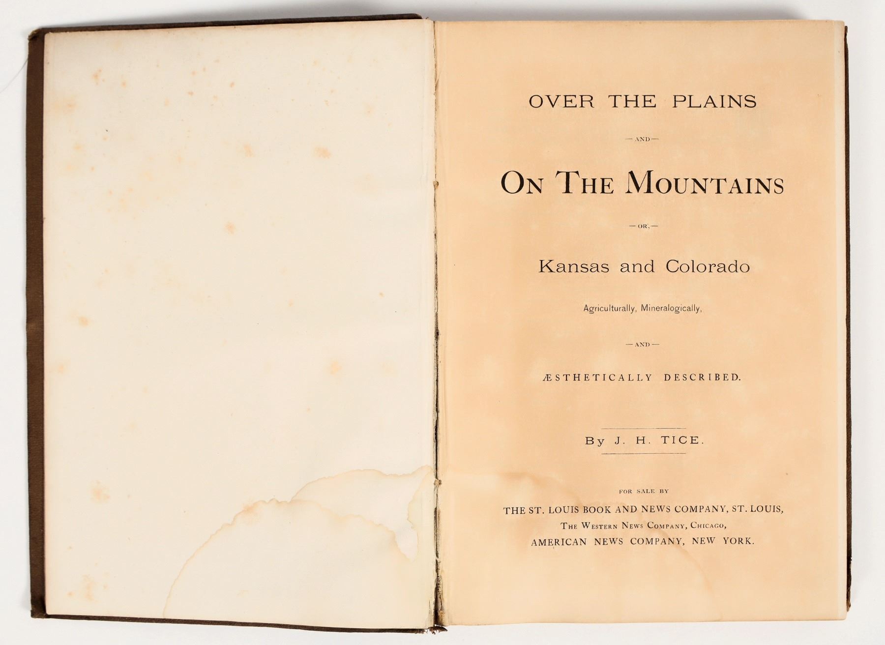 Over the Plains and On The Mountains; or Kansas, Colorado, and the Rocky Mountains; Agriculturally, Mineralogically and Aesthetically Described. First Edition 1872 By John H. Tice. Published St. Louis, Mo. Printed by the "Industrial Age" Printing Co. 202 pages, plus index and ads. Cloth - Hard Cover. Condition: Fair, see photos.