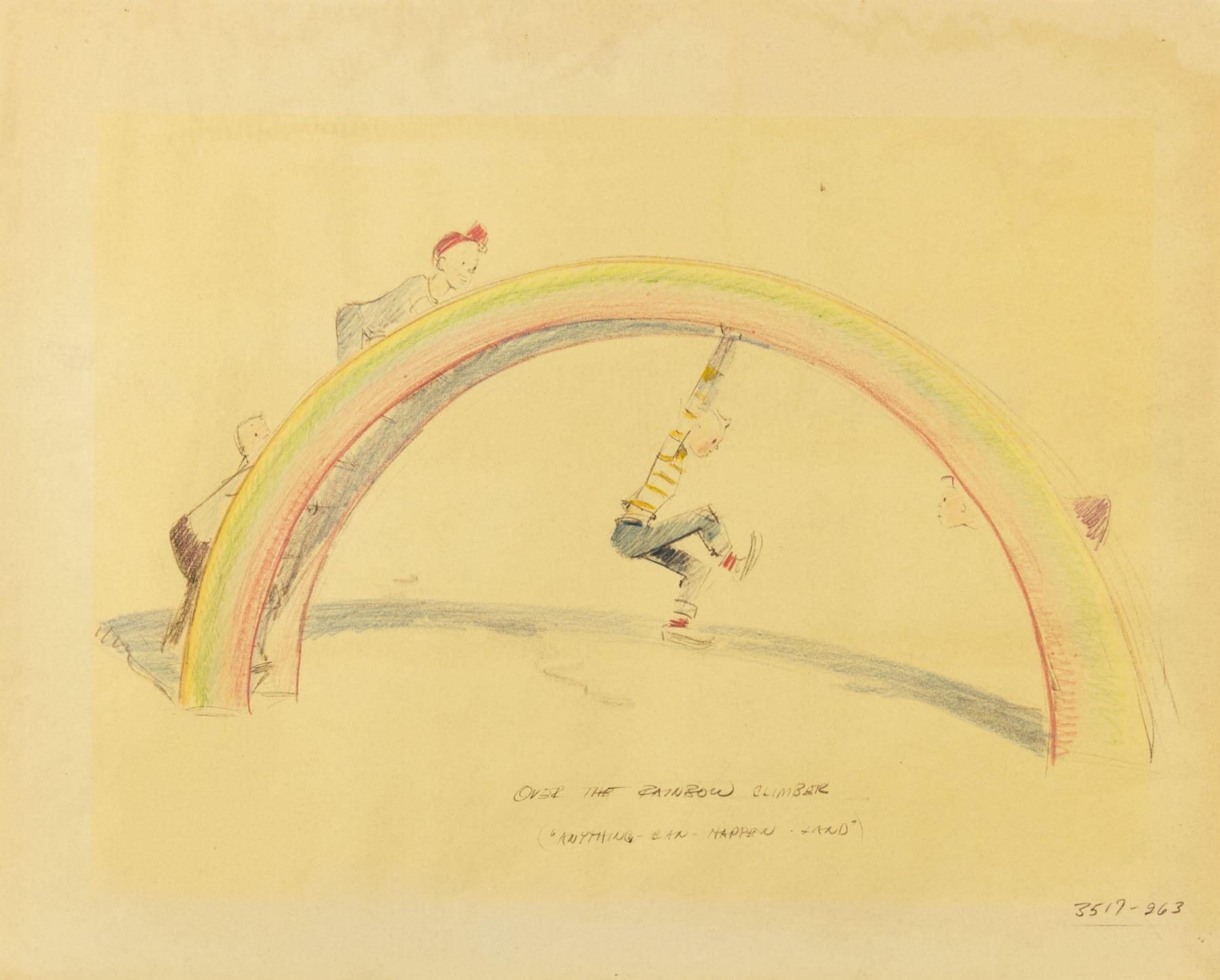 (Disneyland, c.1954) A hand-colored concept brownline by Imagineer Bruce Bushman. Titled "Over the Rainbow Climber", this concept was created for Disneyland's unbuilt Anything-Can-Happen-Land. This brownline features Bushman's initials in pencil on the reverse and measures approximately 19"x23.5". The condition is very good with minor edge-wear and discoloration. The top-edge has a thin strip of tape adhered to the reverse.