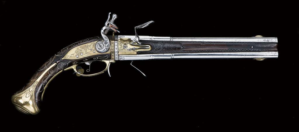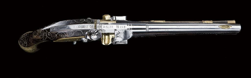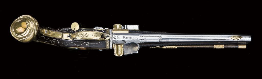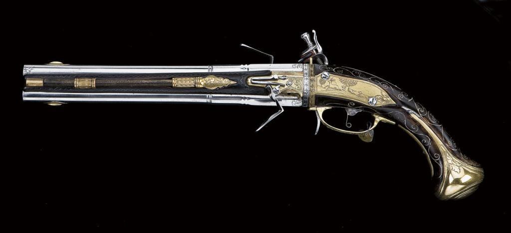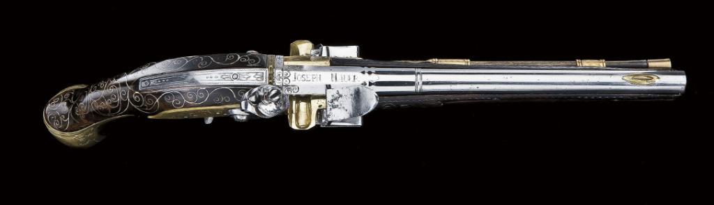 Over-under turn barrel flintlock Horseman’s size pistol signed “Joseph Hauer in Bamburg”. The pistol measures approx. 18” overall with 11” barrels of approx. 50 caliber smoothbore. The pistol shows brass mounts and is nicely engraved on lock and mounts with typical 18th century Germanic hunting scene. The pistol is in its original flintlock configuration with proper hammer, frizzen and small parts including top jaw. The pistol shows a European-style museum polish on metal surfaces. The stock is pewter inlaid simulating the silver wire inlay of the 18th century. This inlay is about 70% intact and stock shows light refinishing. The ramrod is a correct style replacement. An old collection tag is attached which shows “P.L.” embossed on the lead disk and a brass disk numbered “54”. An impressive pistol circa 1750. Est.: $3,000-$6,000.