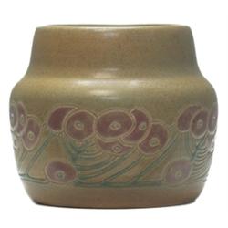 Overbeck vase, stlyzed floral design incised and painted with a tan and mauve glaze, 2.5”h, impressed mark, artist initials, nicely done