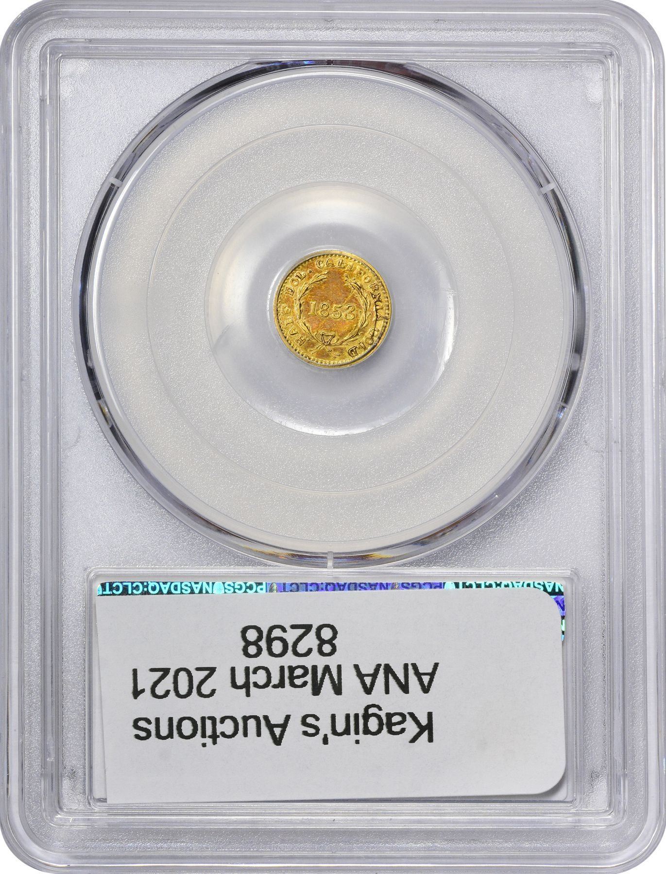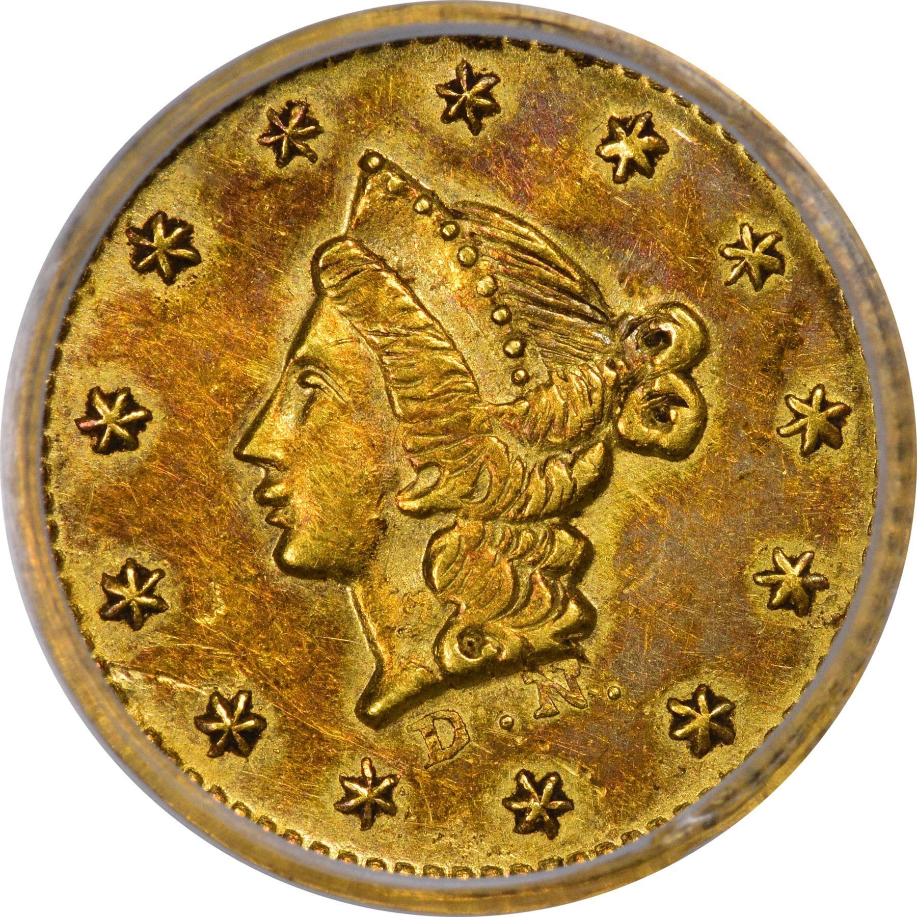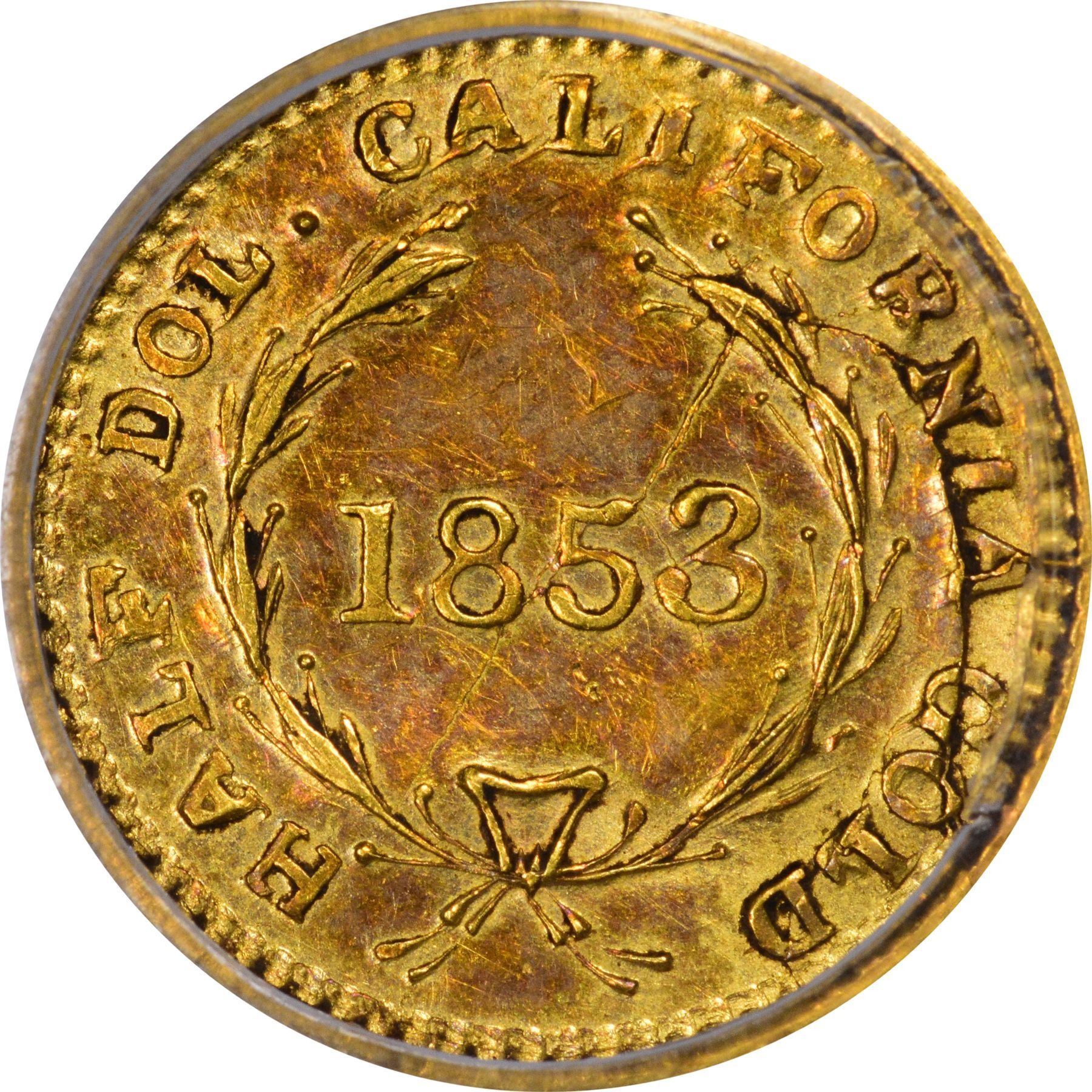 Description: 1853/2 D. N. round Half Dol., BG-409, Die State IV (shattered reverse die, large retained “cud”). PCGS AU58. Same obverse die; reverse unused die similar to BG-401 with 2 of date altered to 3. Yellow gold with attractive light rose toning in fields. PCGS AU58 William C. O’Connor (PCGS# 104456).