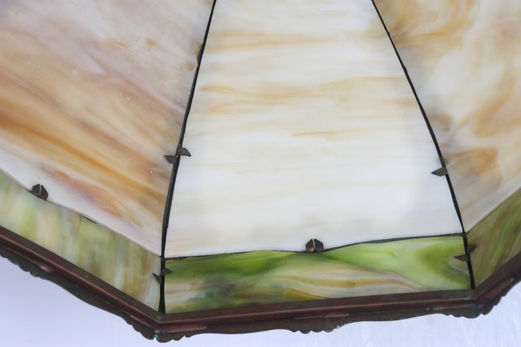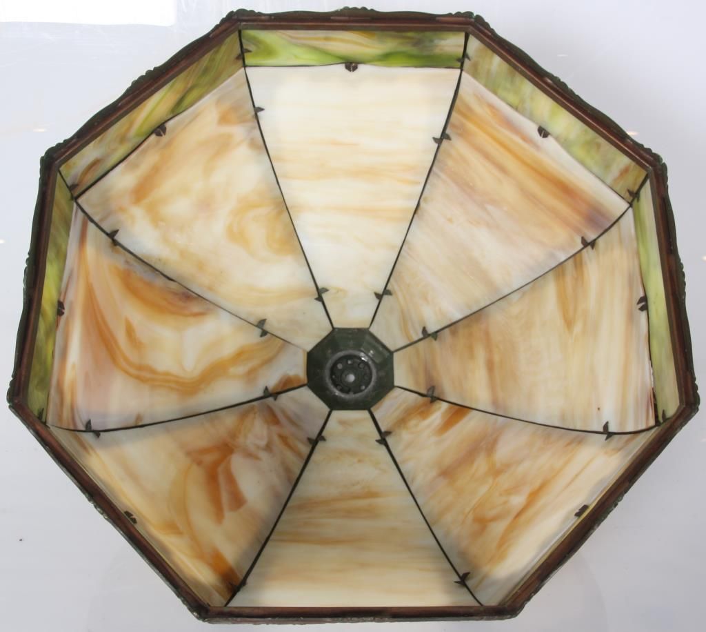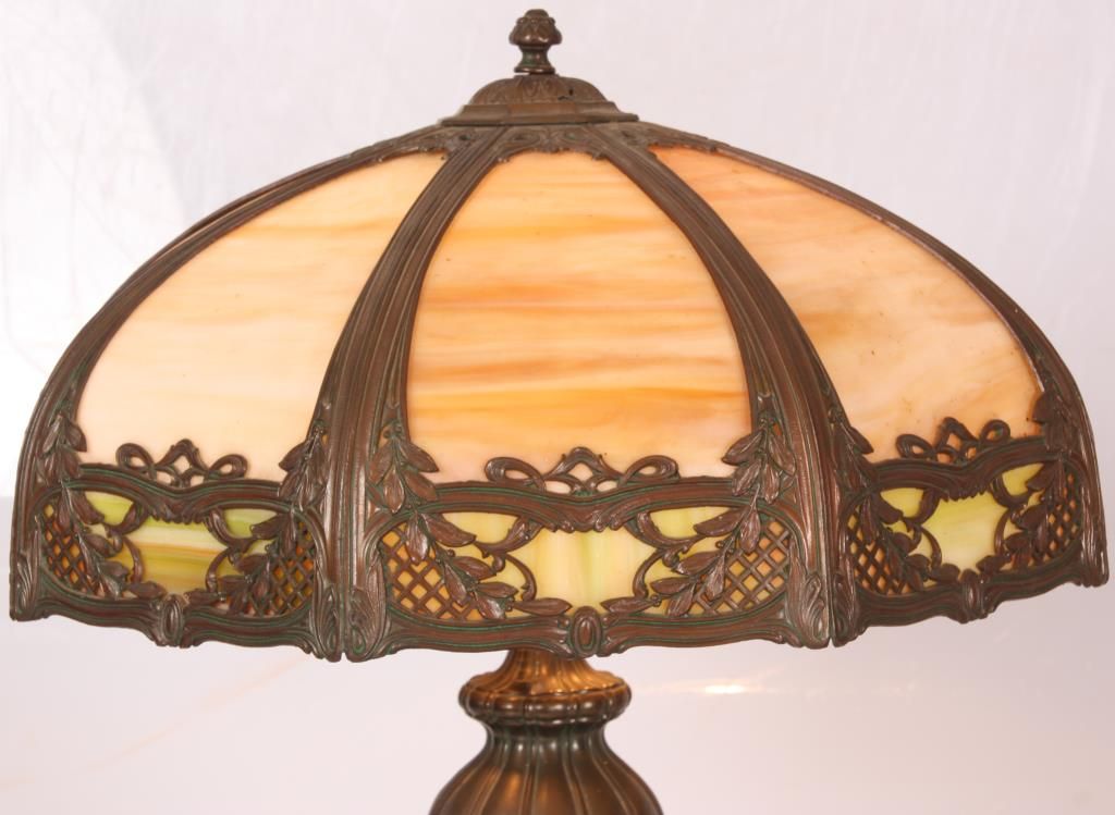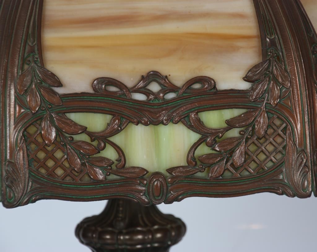 Overlay Slag Panel Table Lamp. Domical 8 panel shade has bent caramel slag glass panels over a lower border of straight green slag panels, overlaid with leafy filigree. has a 2 socket base with original sockets and pulls, in good overall condition with no broken panels. 18.5 in. dia. x 25 in. high