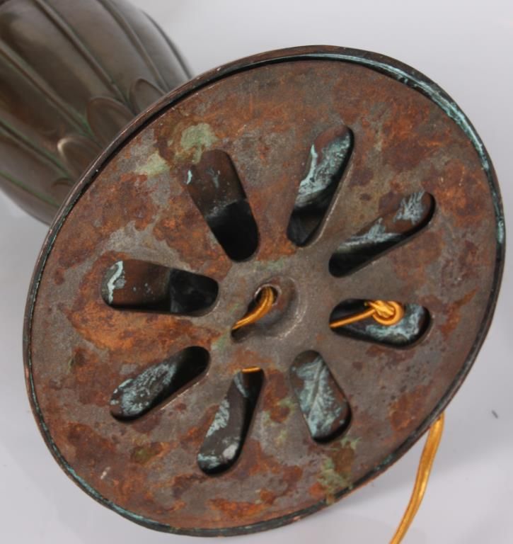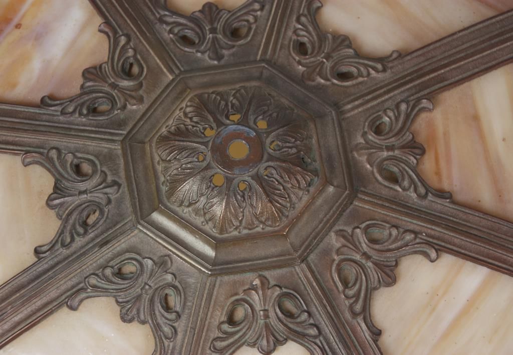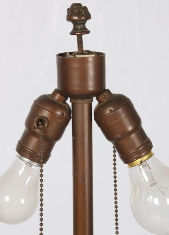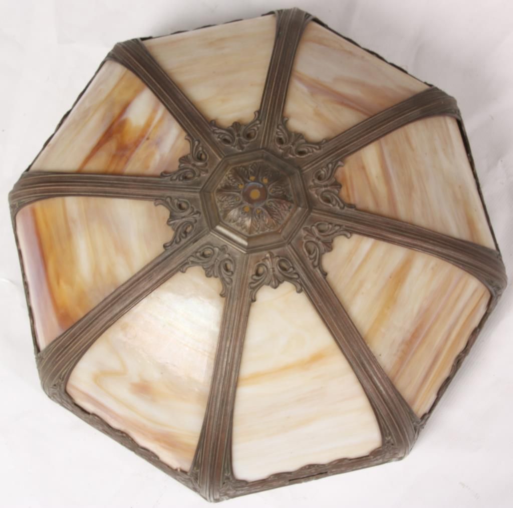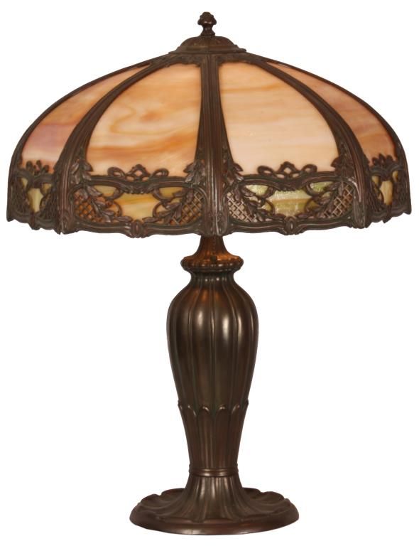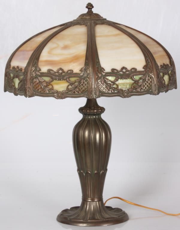 Overlay Slag Panel Table Lamp. Domical 8 panel shade has bent caramel slag glass panels over a lower border of straight green slag panels, overlaid with leafy filigree. has a 2 socket base with original sockets and pulls, in good overall condition with no broken panels. 18.5 in. dia. x 25 in. high