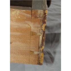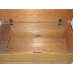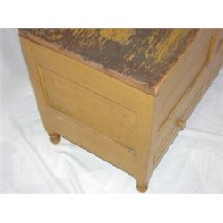 Overpainted blanket chest with two drawers on bottom and turned feet. Measures 23" tall, 36" wide, 18 1/4" deep. Missing molding on both sides of lid. Drawers are dovetailed.