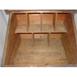 Primitive overpainted schoolmaster's desk with drawer with tapered legs. Measures 43 3/4" tall, 23 1/2" wide, and 24" deep.