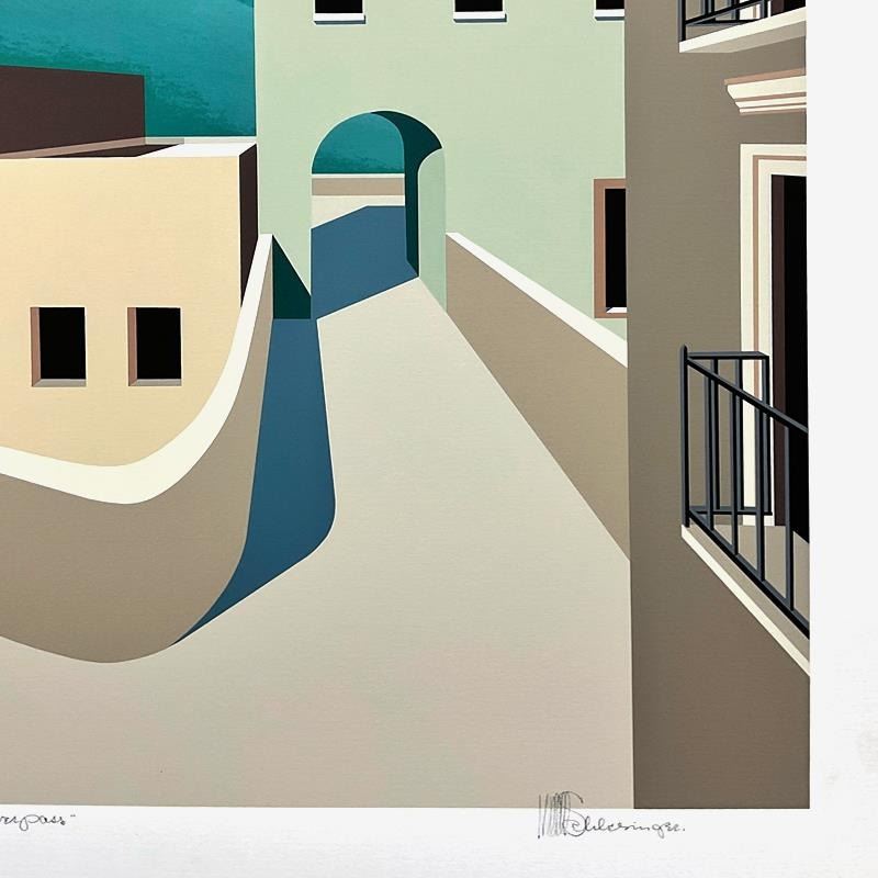 "Overpass" is a limited edition serigraph on paper by William Schlesinger (1915-2011), numbered 142/295 and hand signed by the artist. Includes Letter of Authenticity. Measures approx. 33.5" x 30" (border), 28.5" x 24" (image). Please note: There are mino