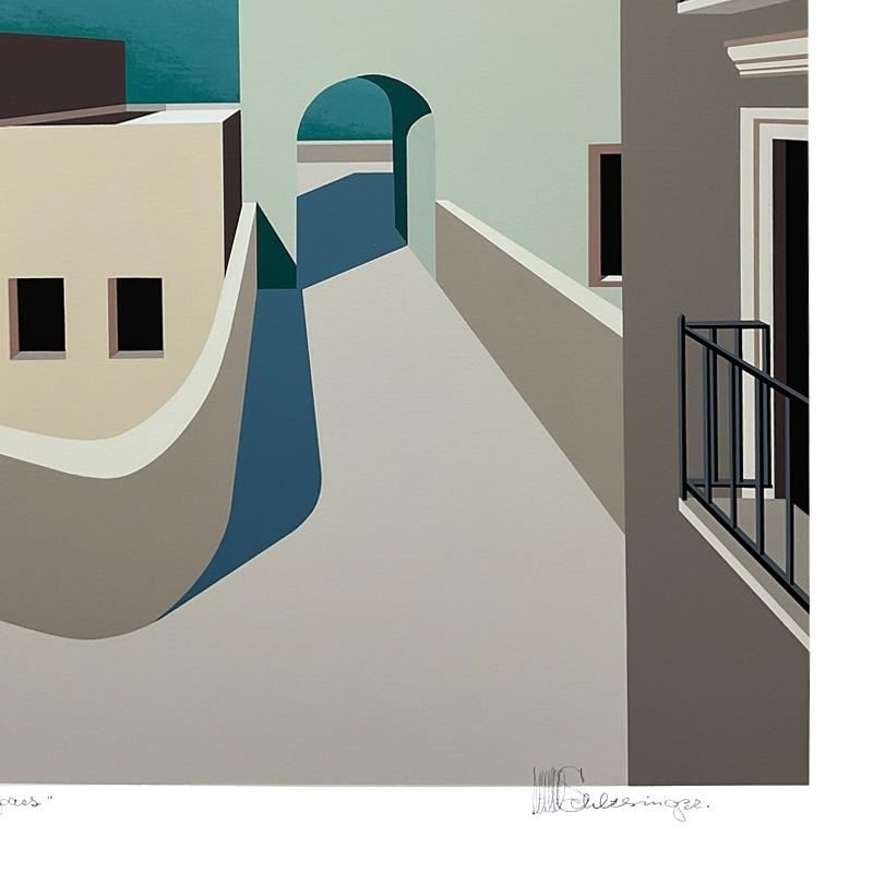 "Overpass" is a limited edition serigraph on paper by William Schlesinger (1915-2011), numbered 25/295 and hand signed by the artist. Includes Letter of Authenticity. Measures approx. 33.5" x 30" (border), 28.5" x 24" (image). There is a crease on the top-right corner that may be concealed when framed.