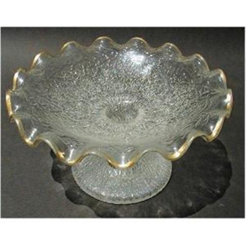 Overshot Compote that is exquisitely done. Normally, a piece like this would be mold blown, but this is all hand blown with a polished pontil. The crimped frilled top is all accentuated with gold trimming. Some of the gold is worn off. After all, this piece is from the 1870's. The short neck from the bottom of the bowl to the top of the footing is stretched, pulled by the glass maker. The stretch marks are clearly visible. The glass itself has a fabulous ring to it because of the high lead content in this glass. The top is 9 1/4 inches across and it is 5 inches high and is 4 3/4 inches across at the bottom. Except for the slight wearing of the gold, the glass is perfect.