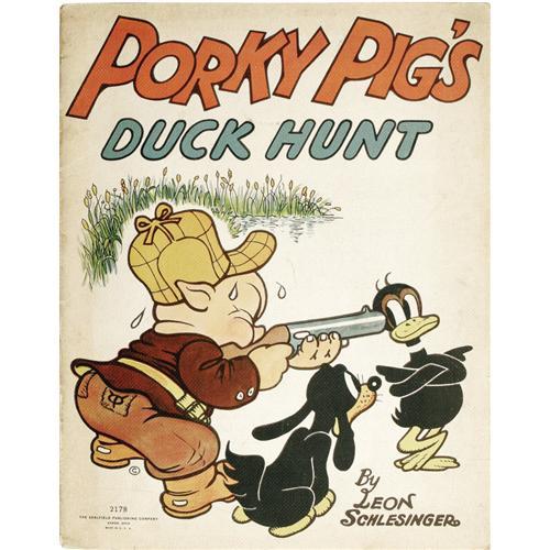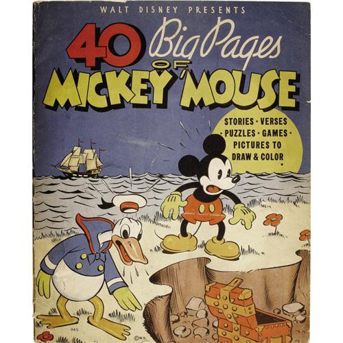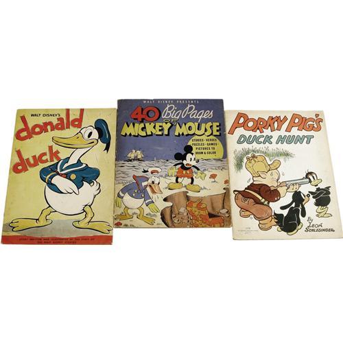 <B>Oversize Early Comic Character Story Books (Various, 1935-38) Condition: Average VG.</B></I> Three oversize children's books: <B>Donald Duck</B></I> #978 Linen-like book (first-ever book devoted to Donald Duck); <B>40 Big Pages of Mickey Mouse</B></I> #945 (called "Rare" by Overstreet; reprints <B>Mickey Mouse Magazine</B></I> #1 with new covers, no ads, and expanded text); and Porky Pig's Duck Hunt</B></I> #2178 Linen-like book (first appearance Porky Pig and Daffy Duck; first book devoted to these characters). Approximate Overstreet value for group = $1,200.
