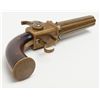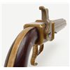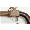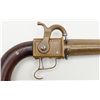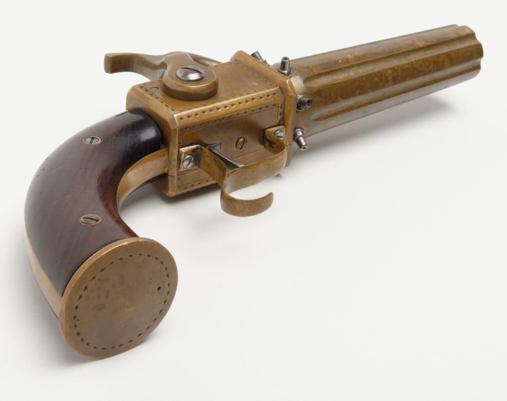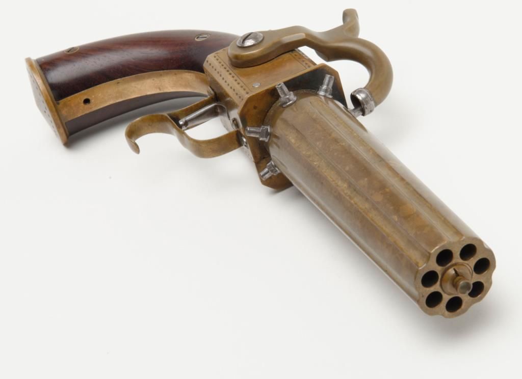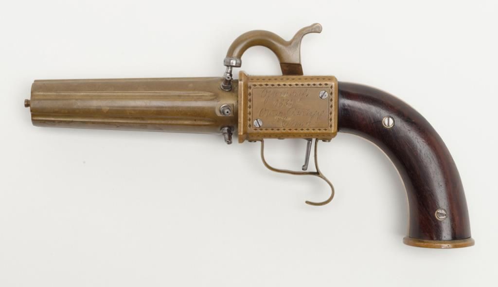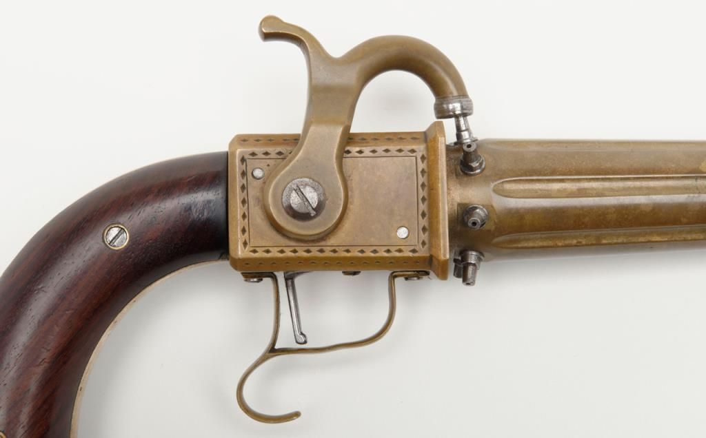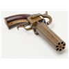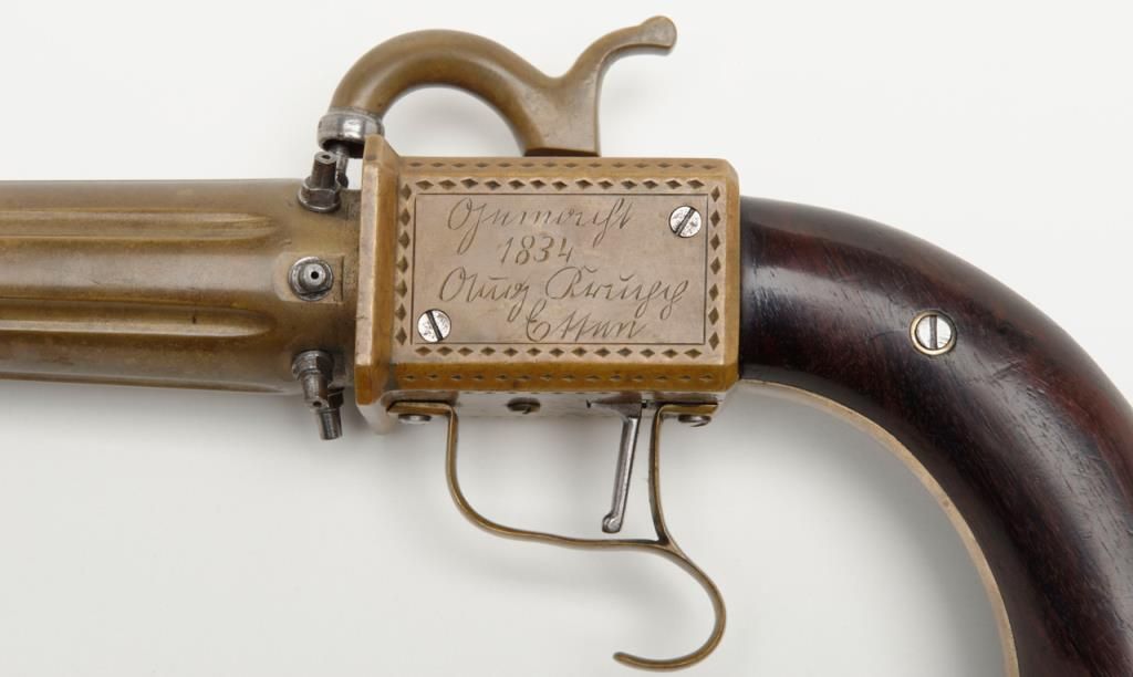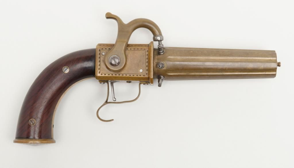 Oversize handmade brass prototype or patent model percussion hand revolver pepper box inscribed on the left side of frame “Ojumorift, 1834, Ouiz, Ruinyy, C Mun” in fancy letters that are hard to read. This showing hardwood grip which may be rose wood. The pistol measures 13” overall with 5 and nearly ½” barrels of approximately .25 caliber 7 shots. The only steel parts on the gun are the nipples and a shoe or cap on the face of the hammer and the screws. It would be impractical and unworkable and we think this is a patent or display model and not meant to be a fired. Note liberated in WW II from museum in Cologne, Germany and acquired by noted collector Mario Pancino from vets estate. Est.: $1500-$3000
