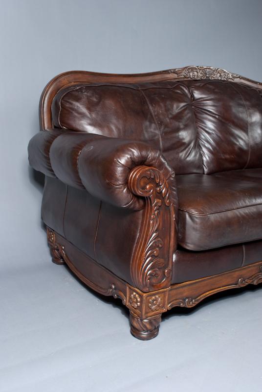 Wood structure with crest, arms and base of scrolling and leaf designs. Upholstered in chocolate brown leather. 43" H x 92" L x 38" D. Wear to leather from use, and nicks and abrasions.