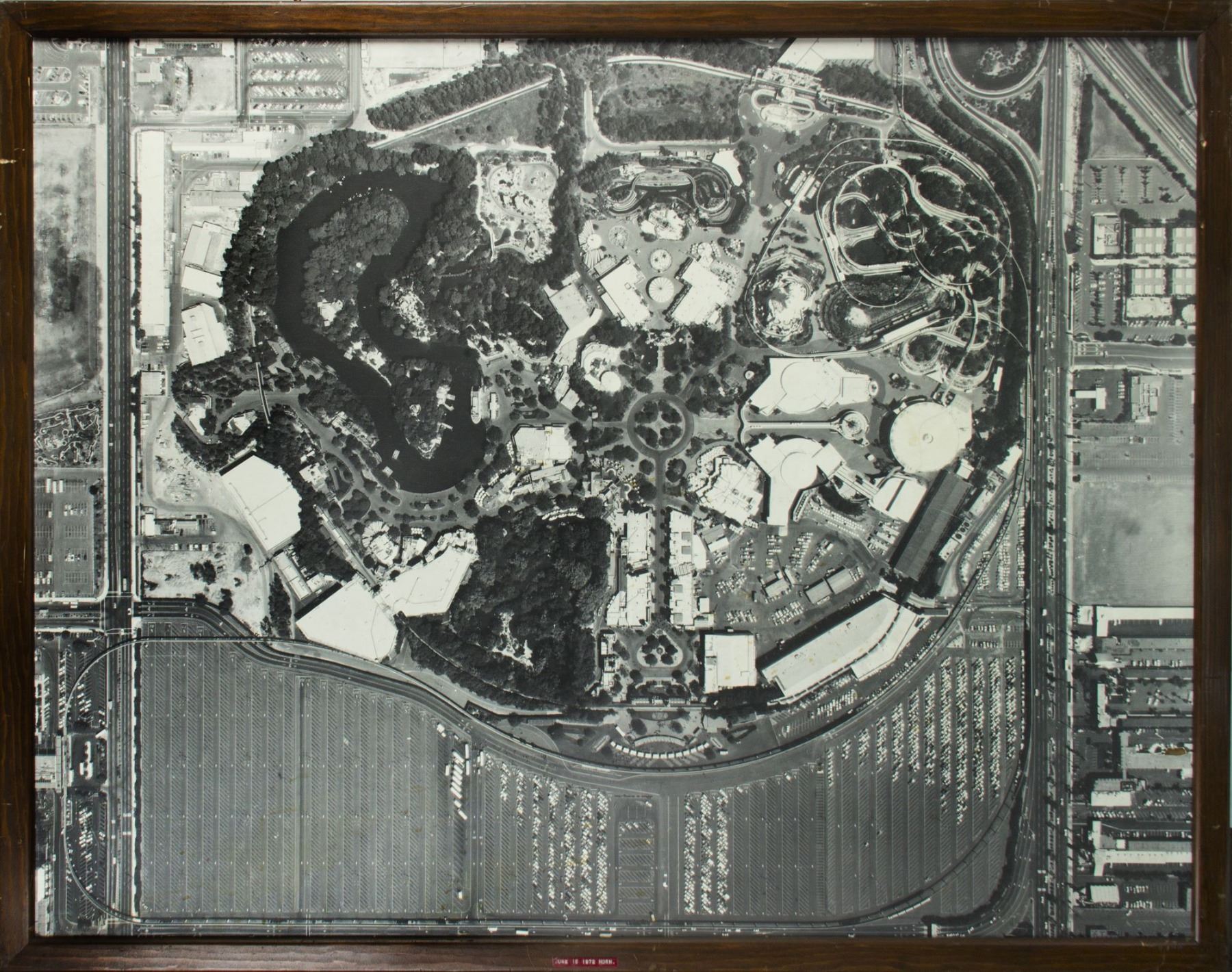 (Disneyland, 1972) An oversized aerial photo of Disneyland that was likely displayed in one of Disney's administration buildings. A label on the front of the frame reads "June 15, 1972". This large high-quality black and white photo beautifully reflects a unique time in Disneyland history, shortly after the opening of Bear Country and prior to the construction of the "Space Mountain" and "Big Thunder Mountain" attractions. The back of the frame still retains the order label from the photography company that took this aerial photo. This photo measures an impressive 57.5"x45.5" within its 61.5"x49.5" frame. The condition is very good with minor wear from use.